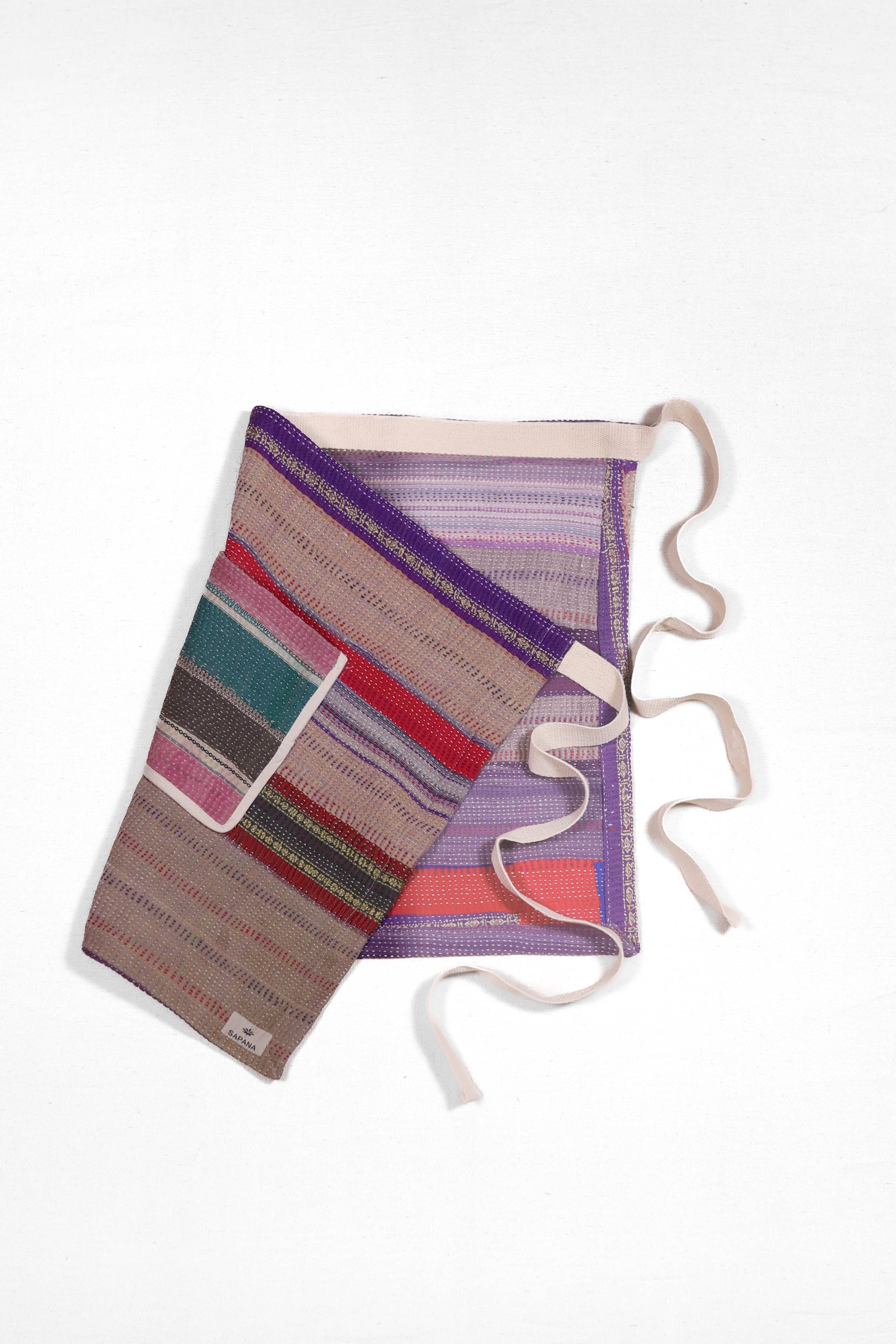 Every apron is one of a kind, made from a vintage kantha quilt. Layers of fabric bound by a hand sewn running stitch - your piece may have markings or worn areas that we find make our apron even more storied and unique.