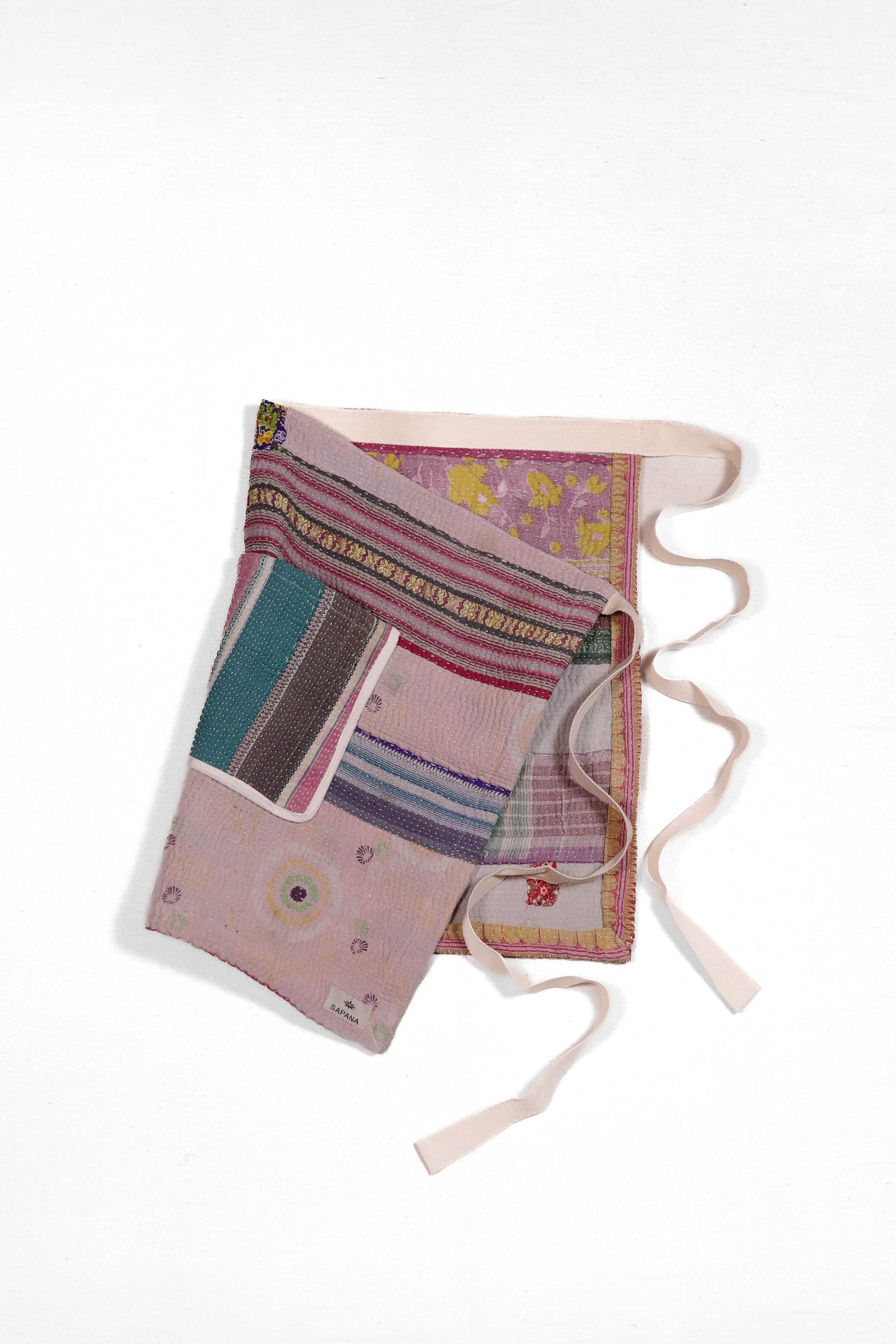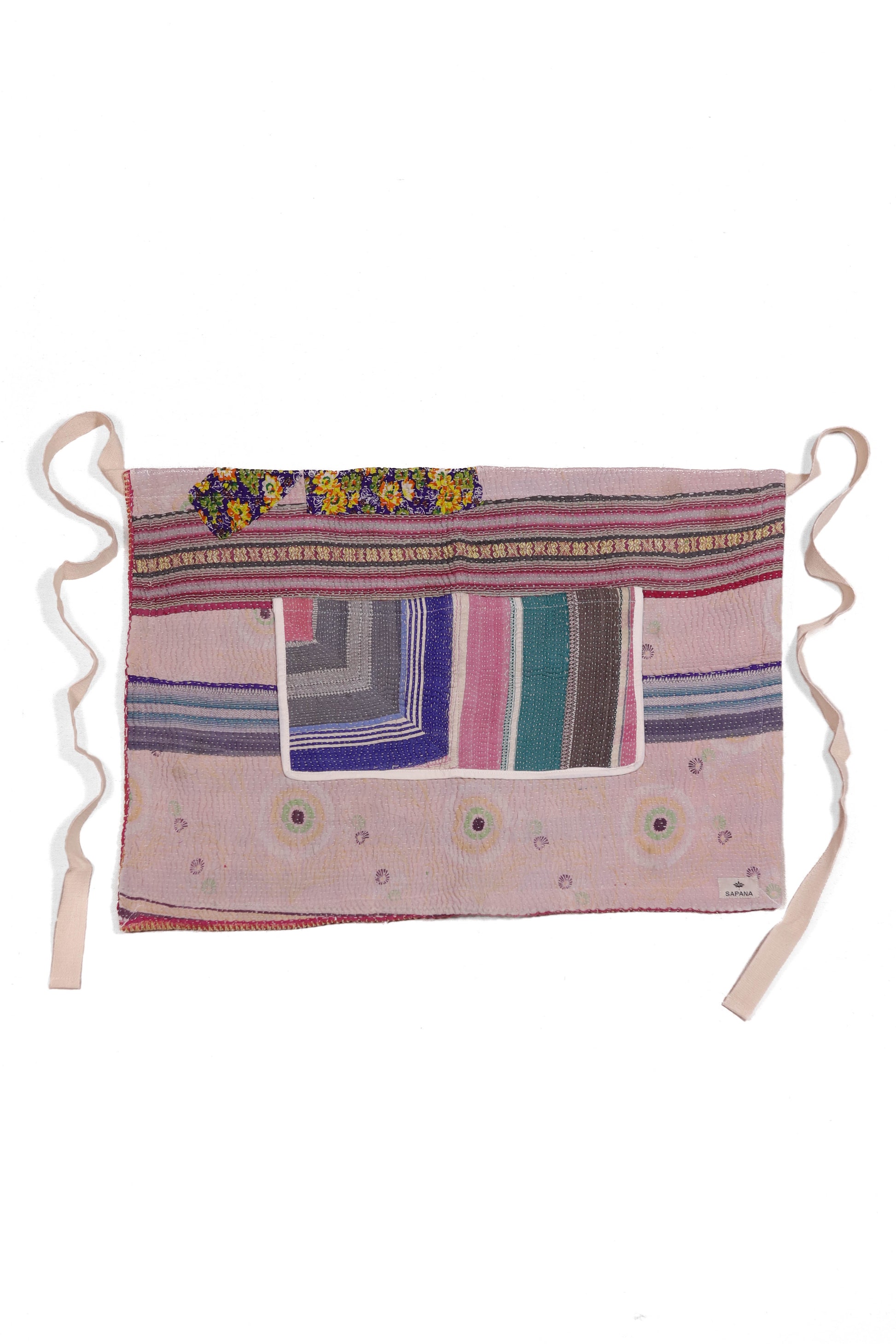 Every apron is one of a kind, made from a vintage kantha quilt. Layers of fabric bound by a hand sewn running stitch - your piece may have markings or worn areas that we find make our apron even more storied and unique.
