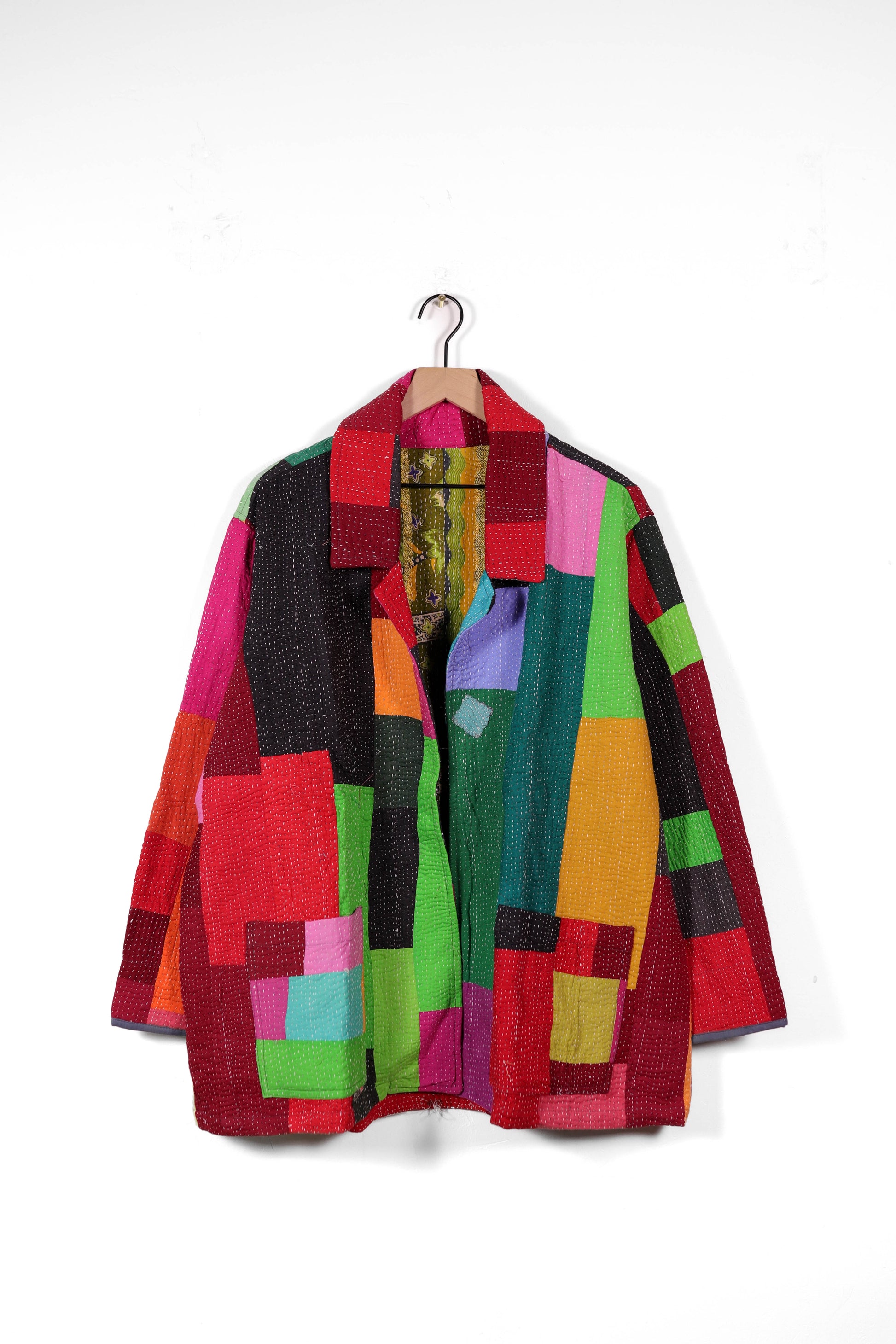 Every coat is one of a kind, made from a vintage kantha quilt. Layers of fabric bound by a hand sewn running stitch - your piece may have markings or worn areas that we find make our coats even more storied and unique.