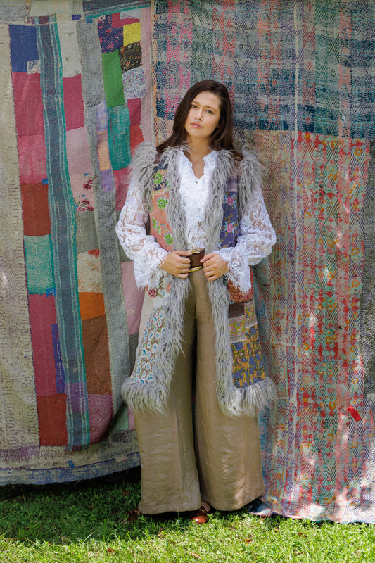 Every coat is one of a kind, made from a vintage kantha quilt. Layers of fabric bound by a hand sewn running stitch - your piece may have markings or worn areas that we find make our coats even more storied and unique.
