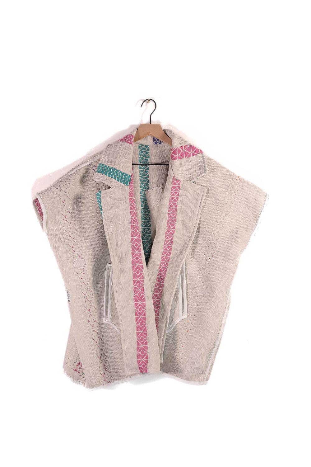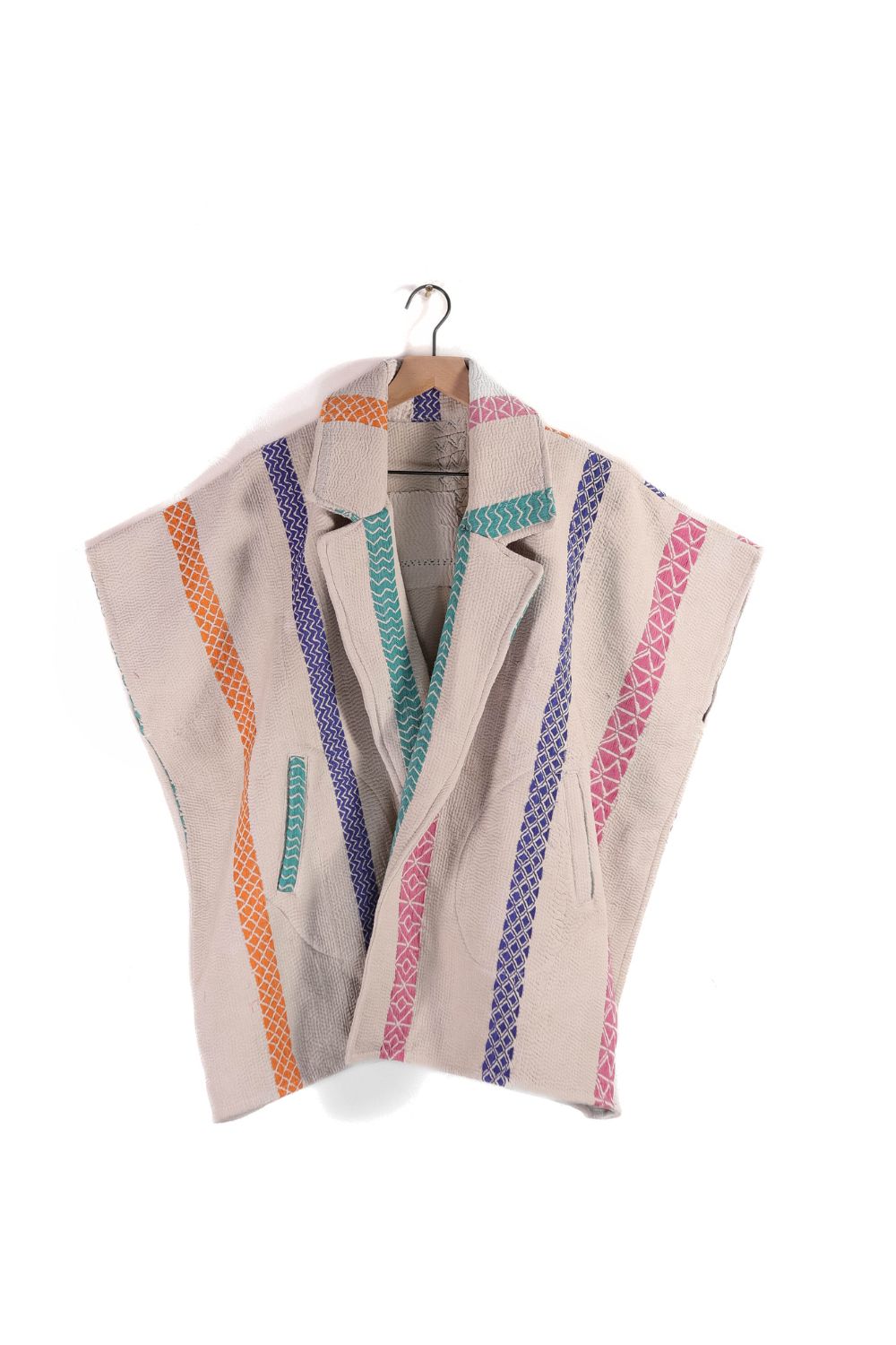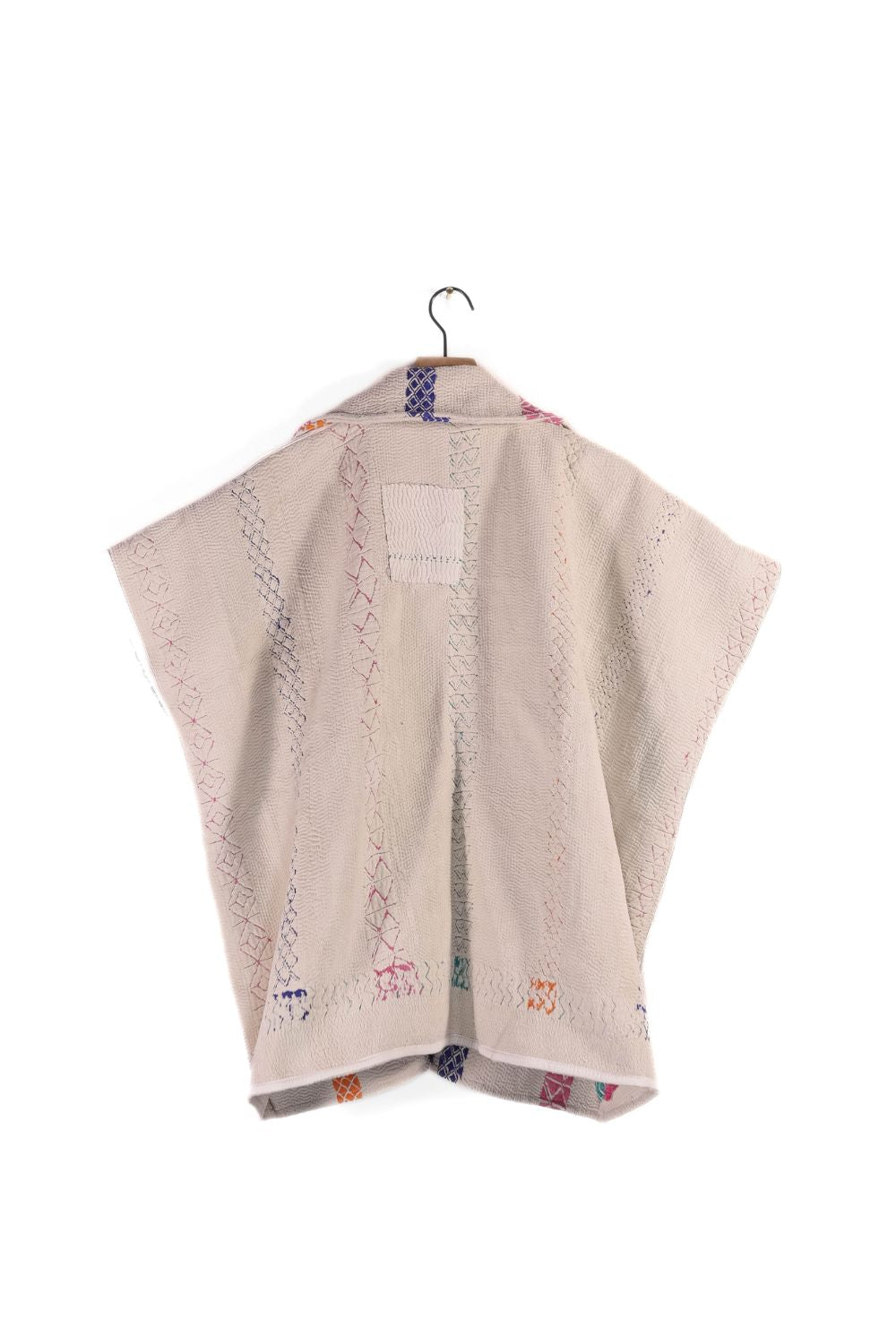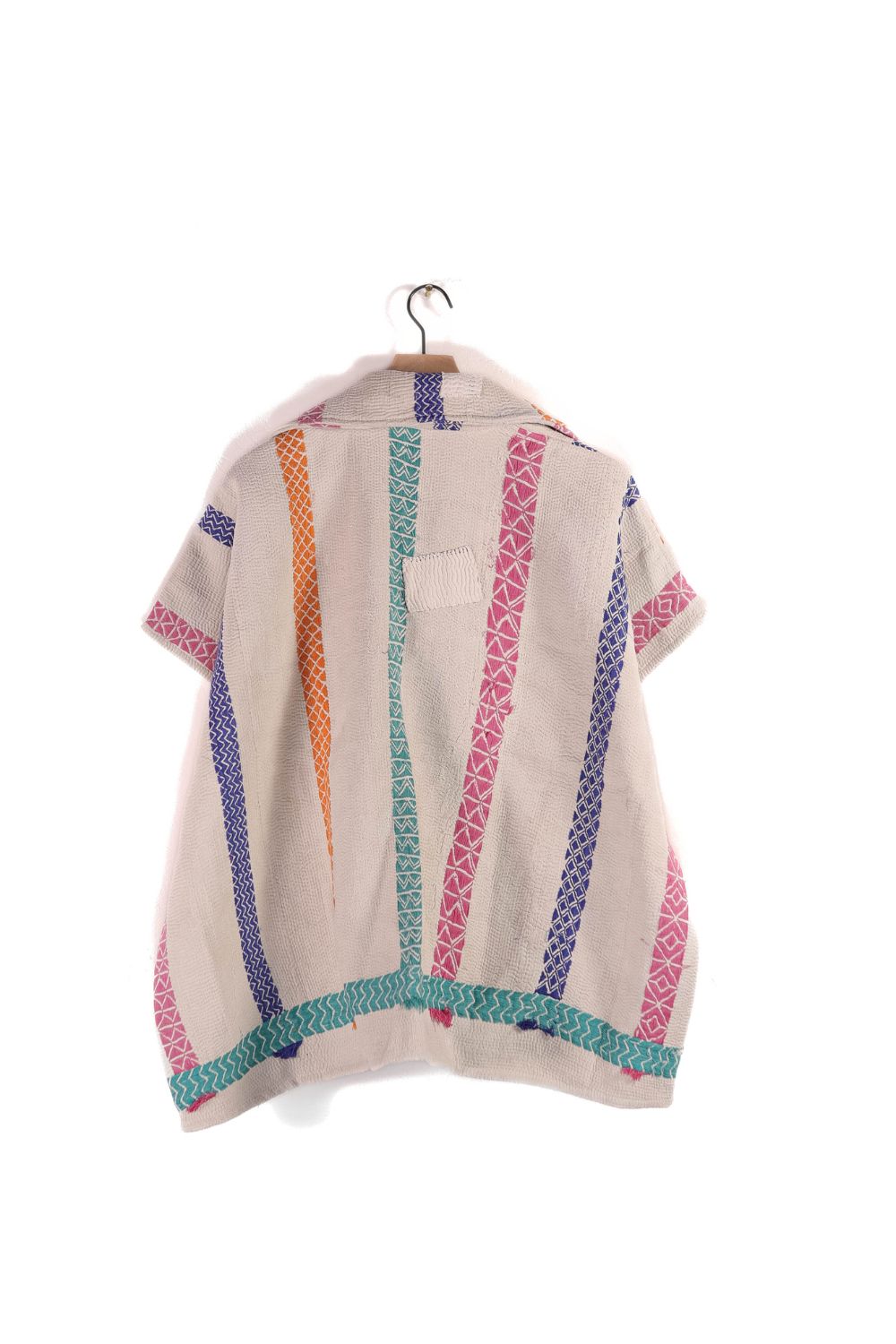Every coat is one of a kind, made from a vintage kantha quilt. Layers of fabric bound by a hand sewn running stitch - your piece may have markings or worn areas that we find make our coats even more storied and unique.