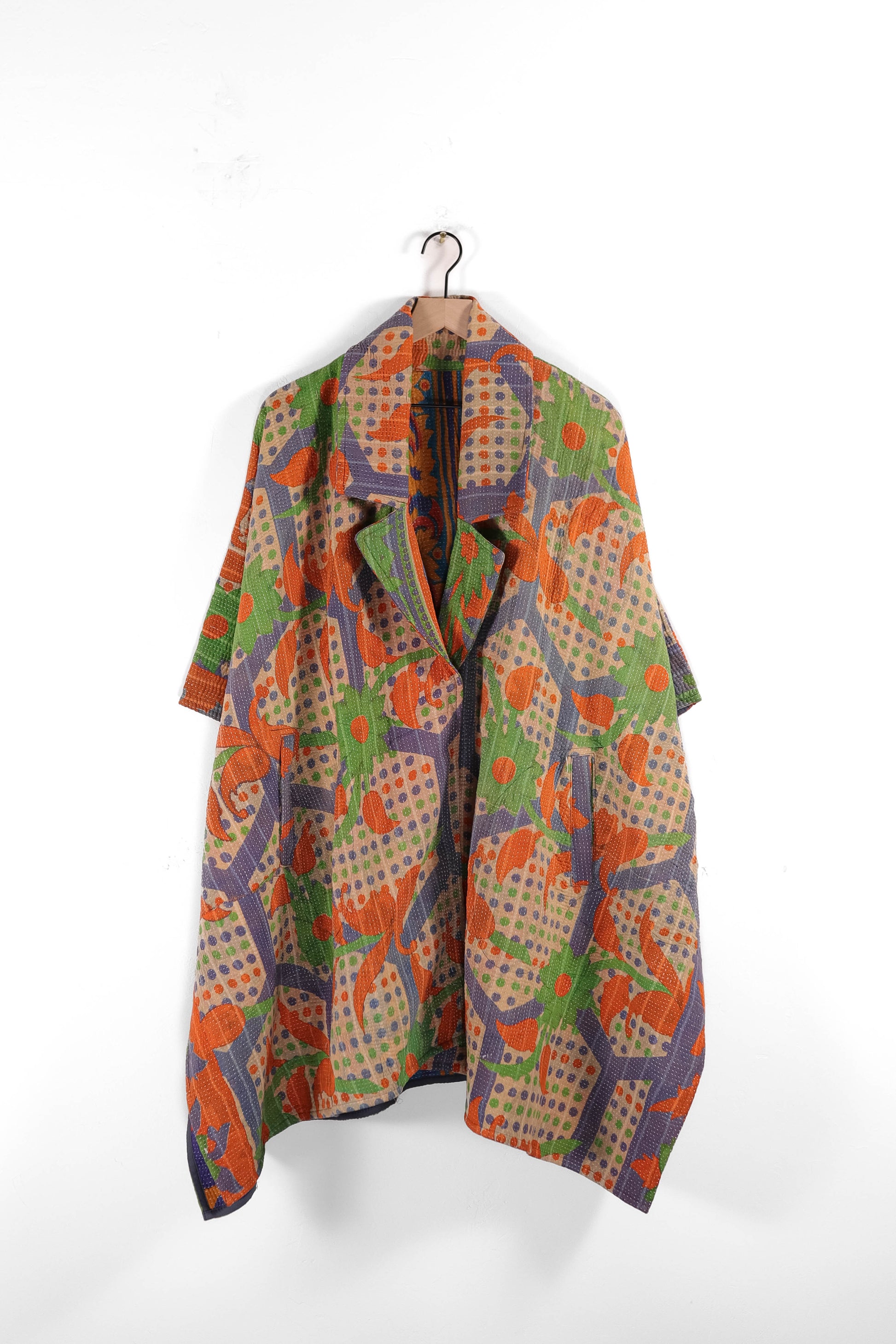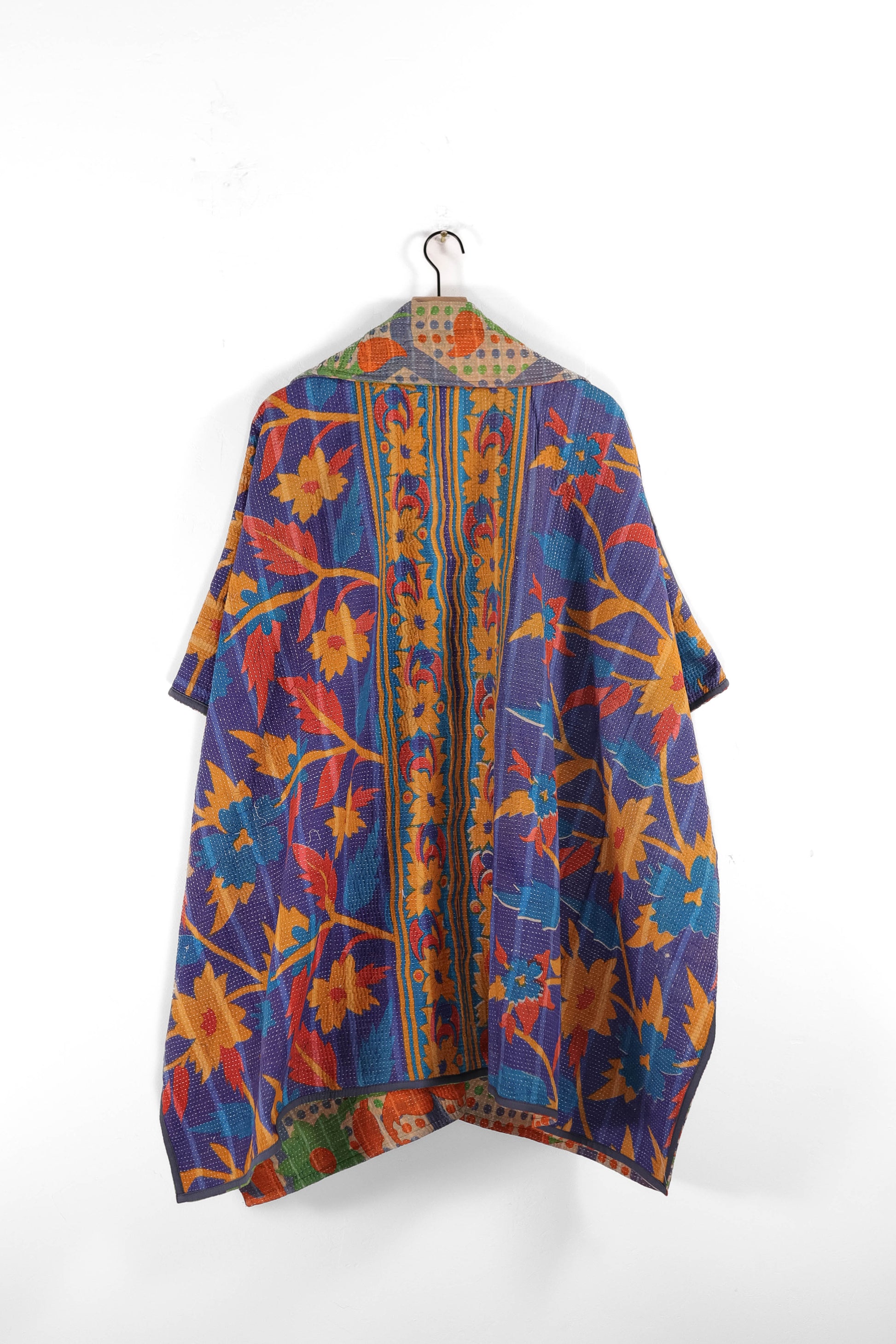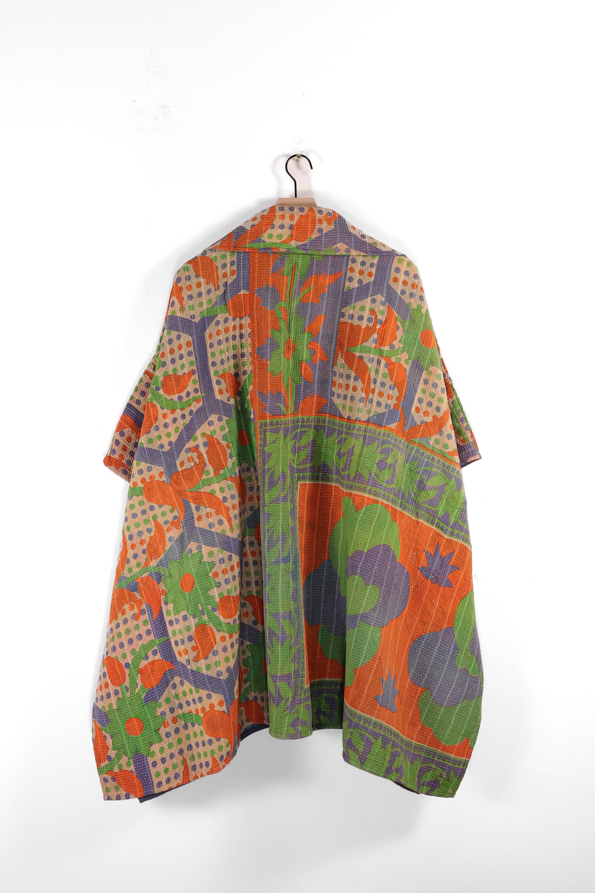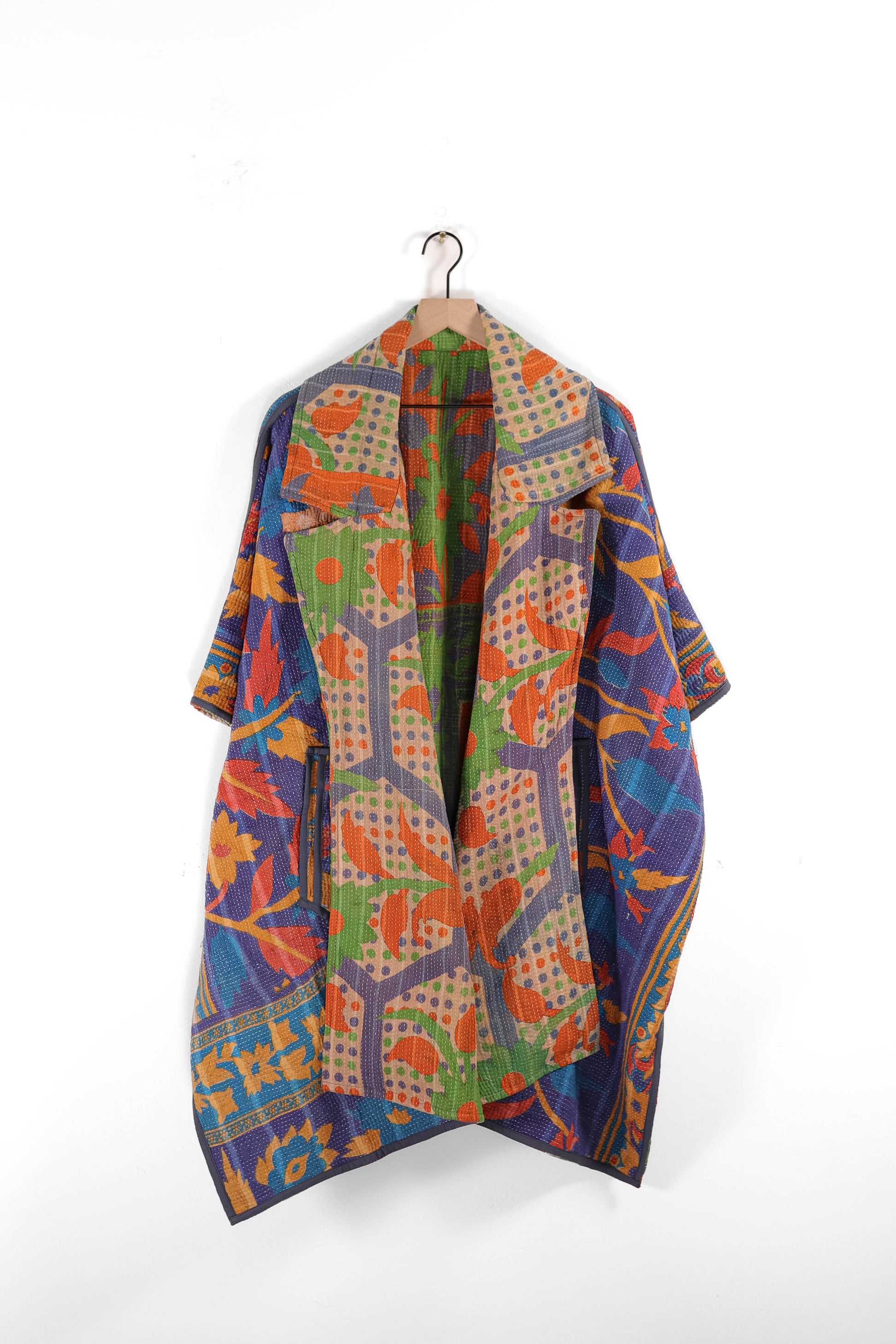 Every coat is one of a kind, made from a vintage kantha quilt. Layers of fabric bound by a hand sewn running stitch - your piece may have markings or worn areas that we find make our coats even more storied and unique.