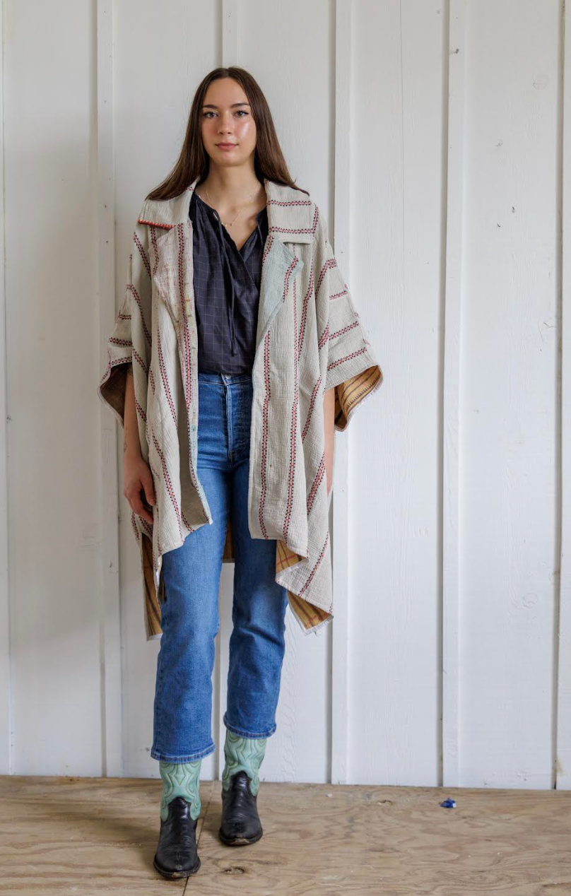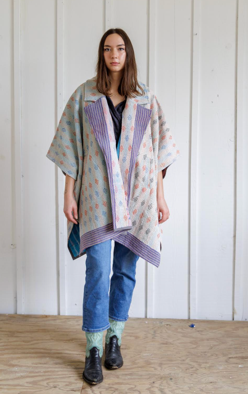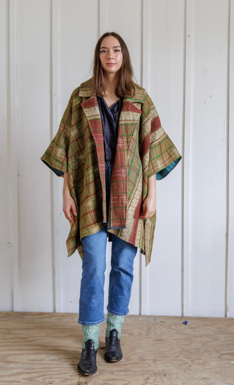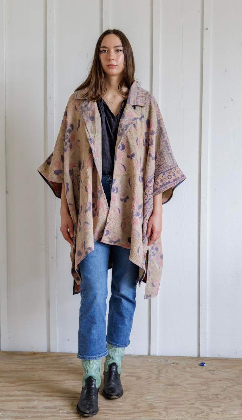 Every coat is one of a kind, made from a vintage kantha quilt. Layers of fabric bound by a hand sewn running stitch - your piece may have markings or worn areas that we find make our coats even more storied and unique.