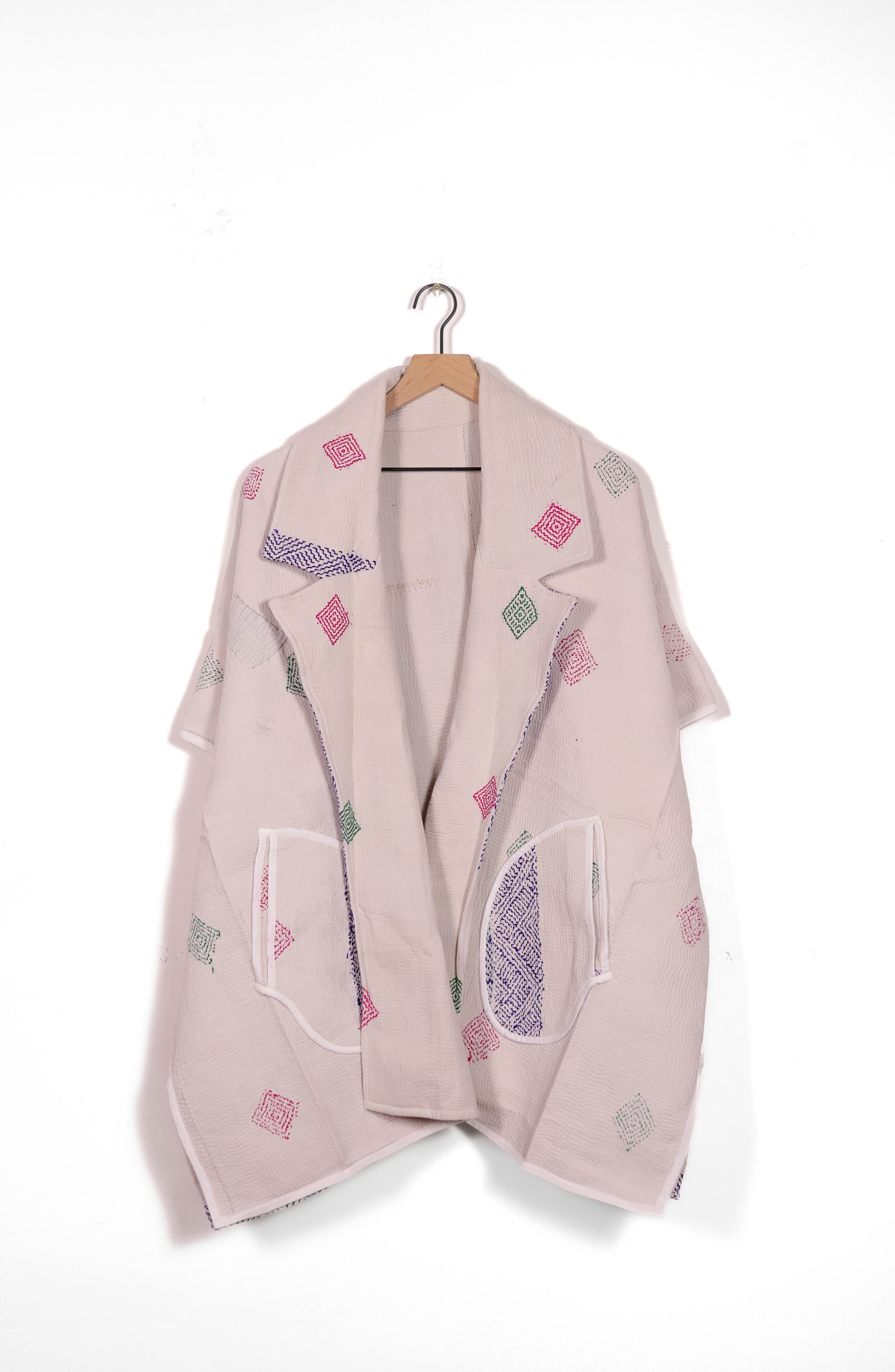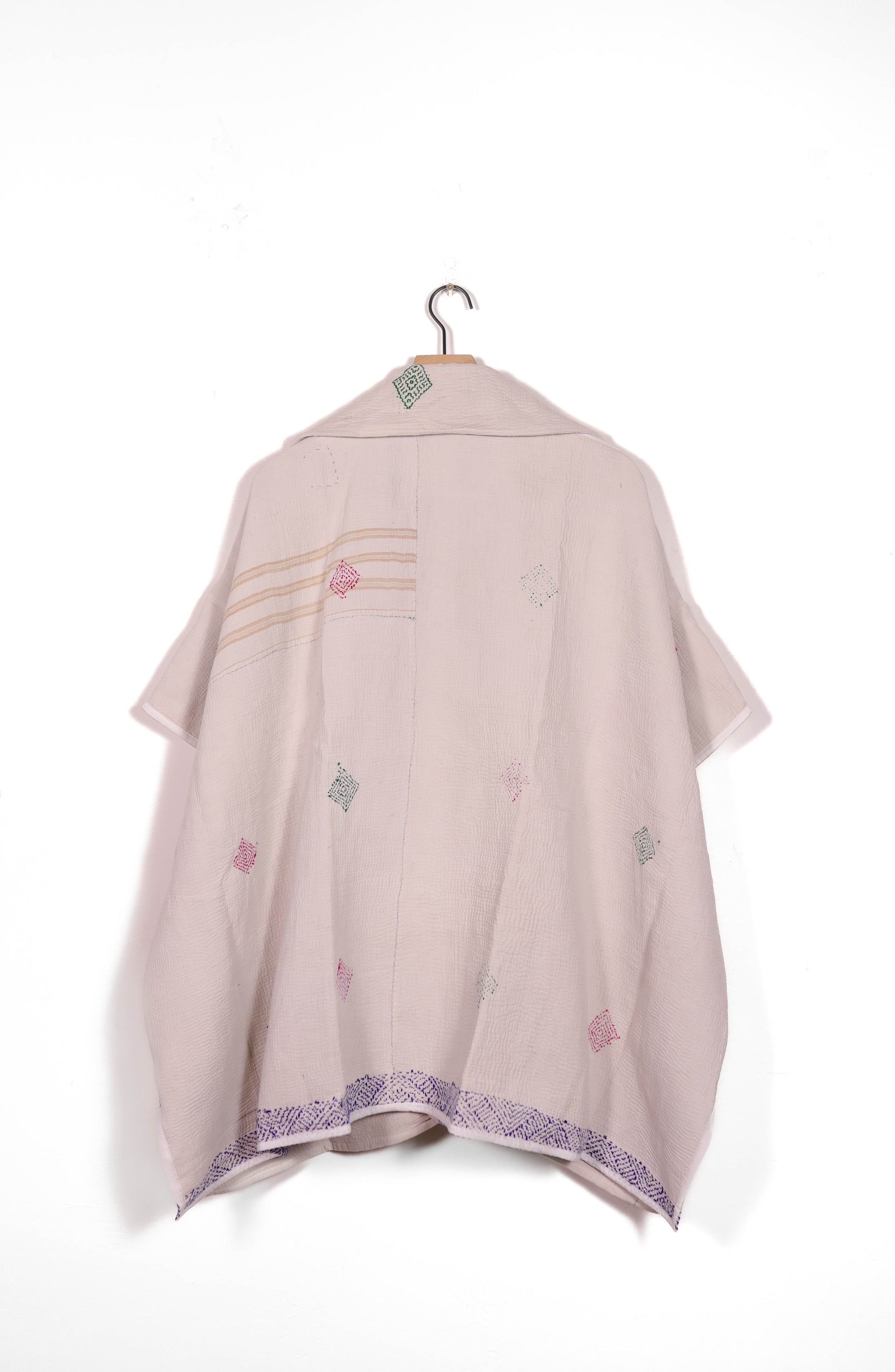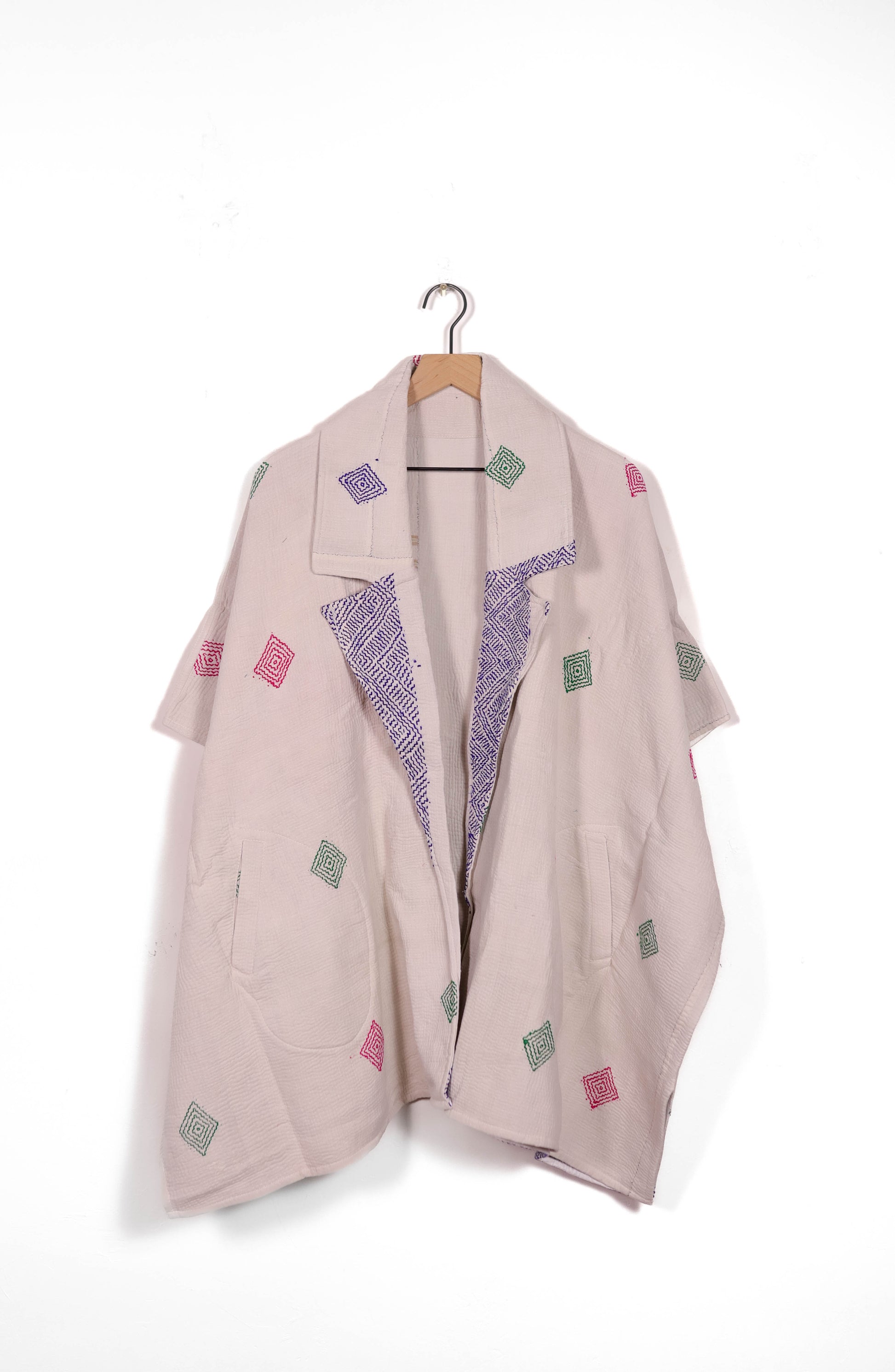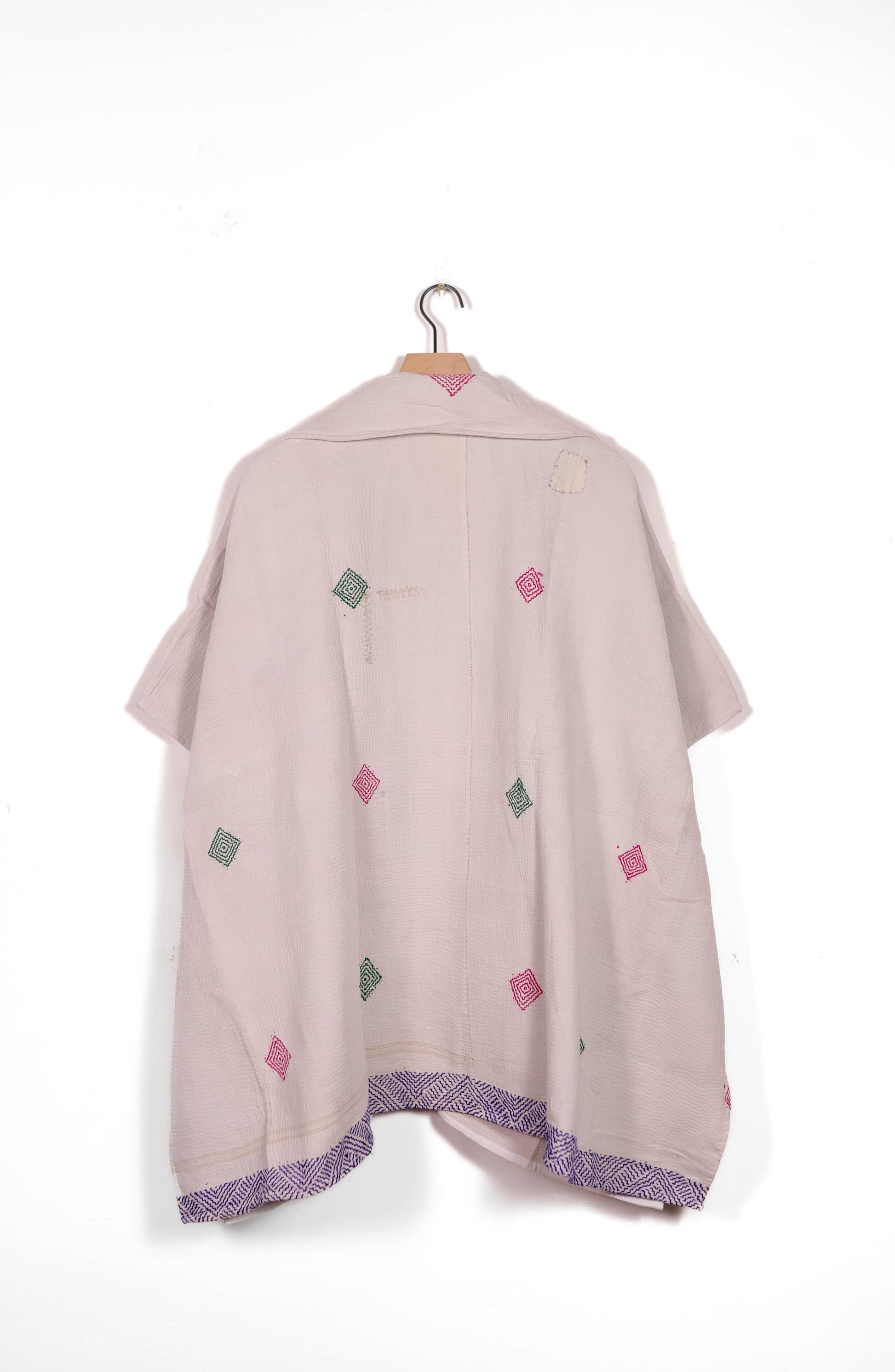 Every coat is one of a kind, made from a vintage kantha quilt. Layers of fabric bound by a hand sewn running stitch - your piece may have markings or worn areas that we find make our coats even more storied and unique.