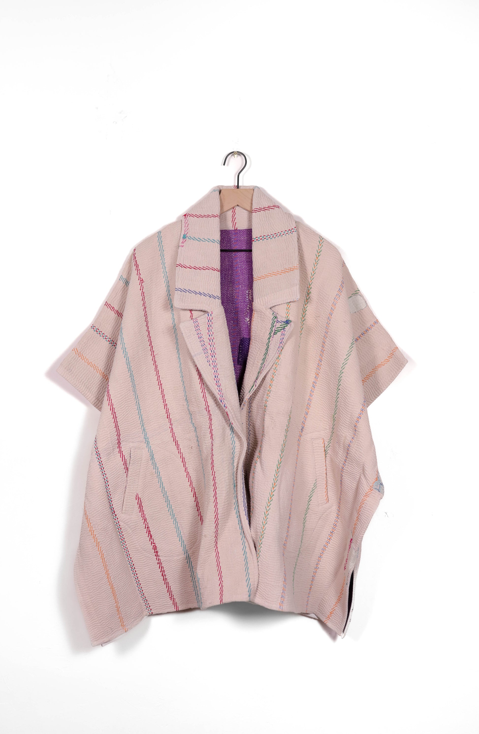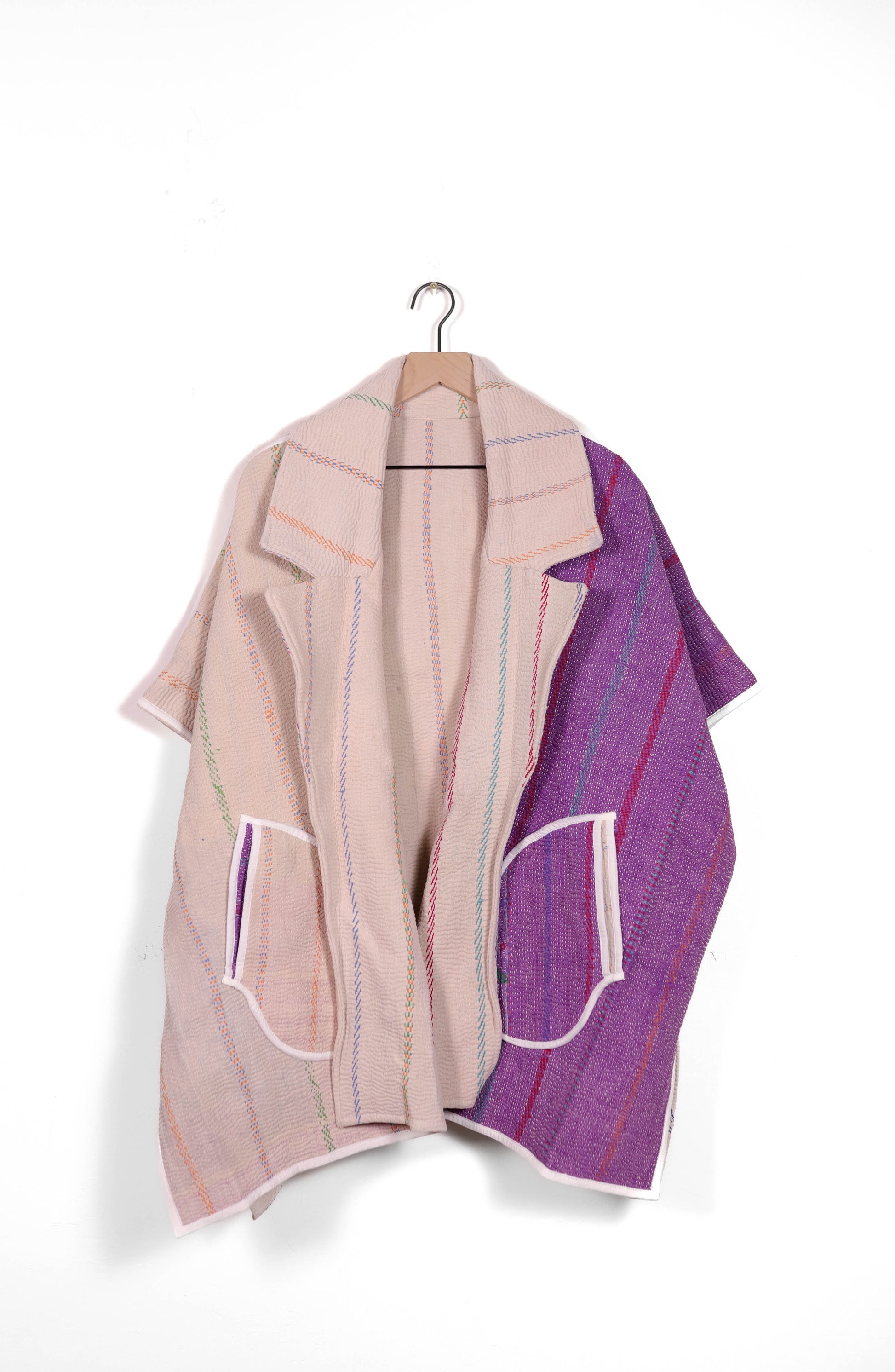 Every coat is one of a kind, made from a vintage kantha quilt. Layers of fabric bound by a hand sewn running stitch - your piece may have markings or worn areas that we find make our coats even more storied and unique.
