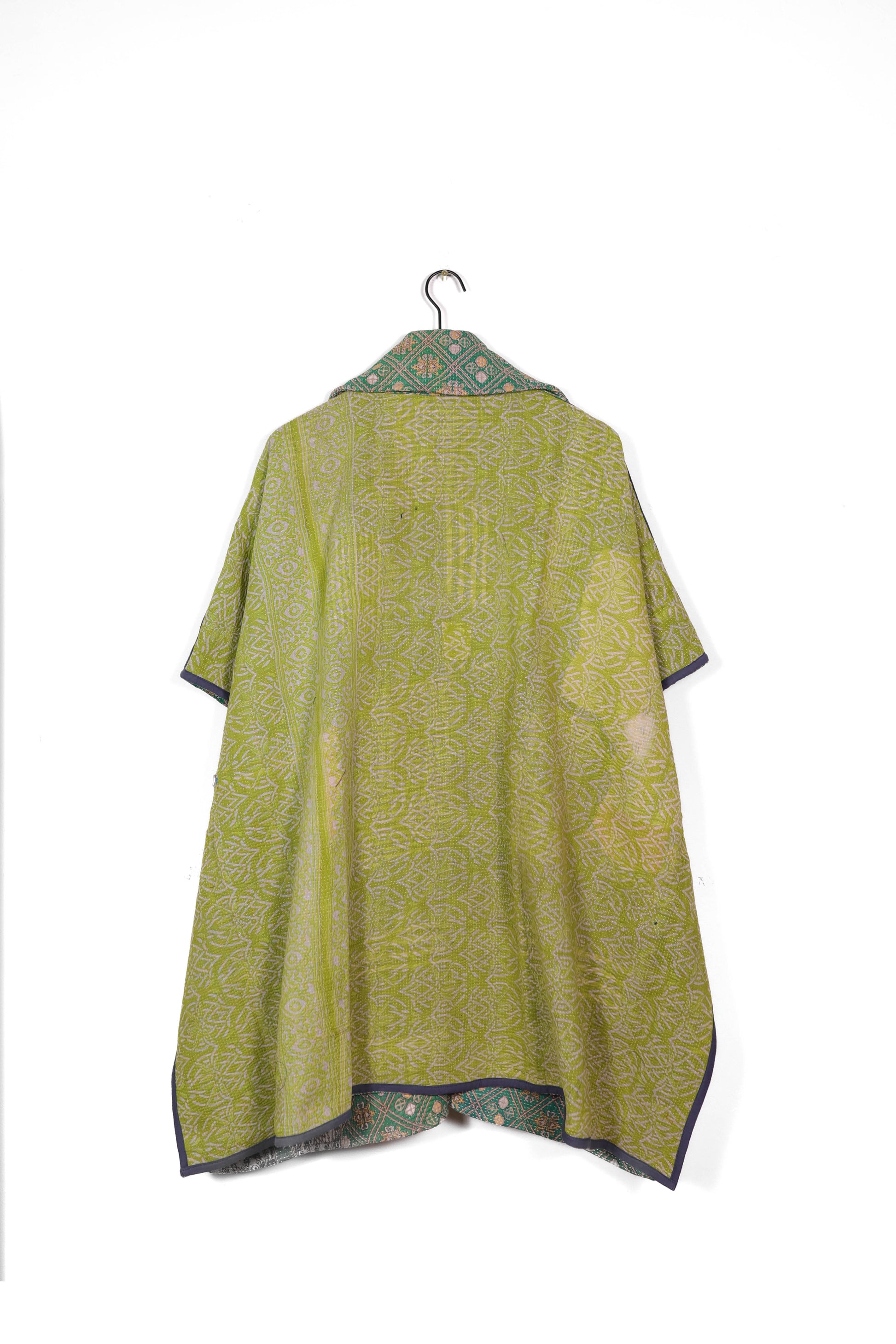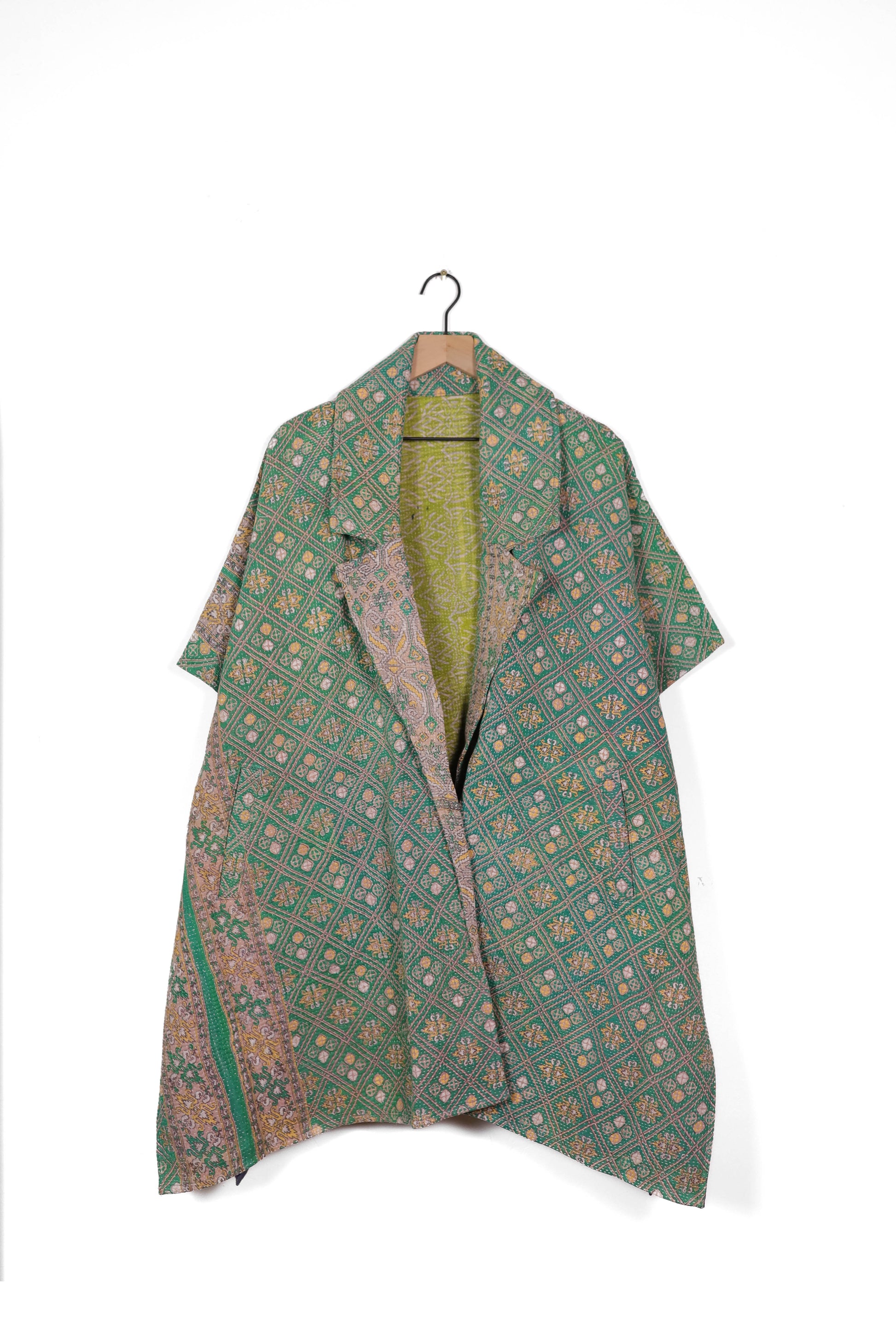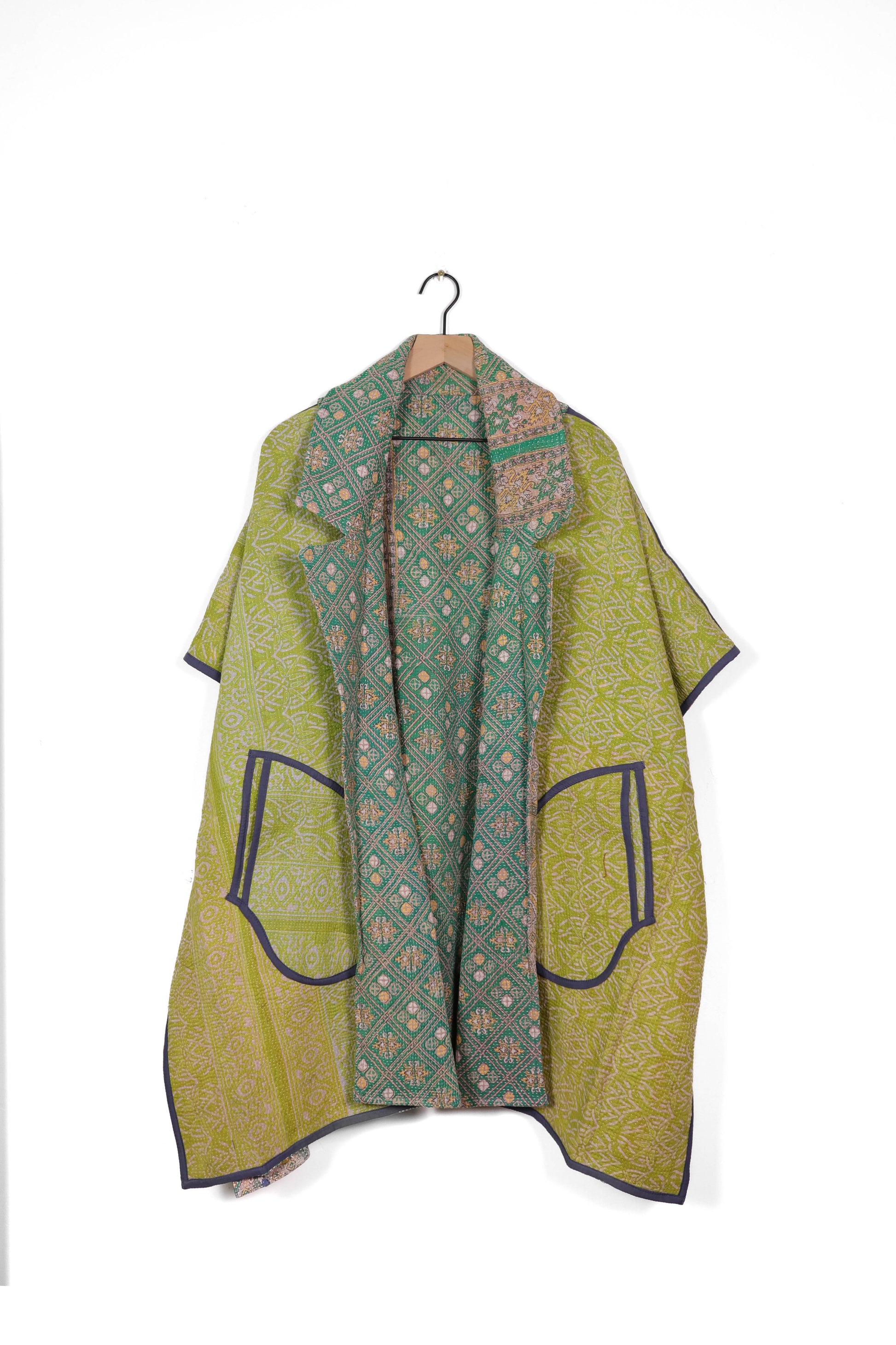 Every coat is one of a kind, made from a vintage kantha quilt. Layers of fabric bound by a hand sewn running stitch - your piece may have markings or worn areas that we find make our coats even more storied and unique.