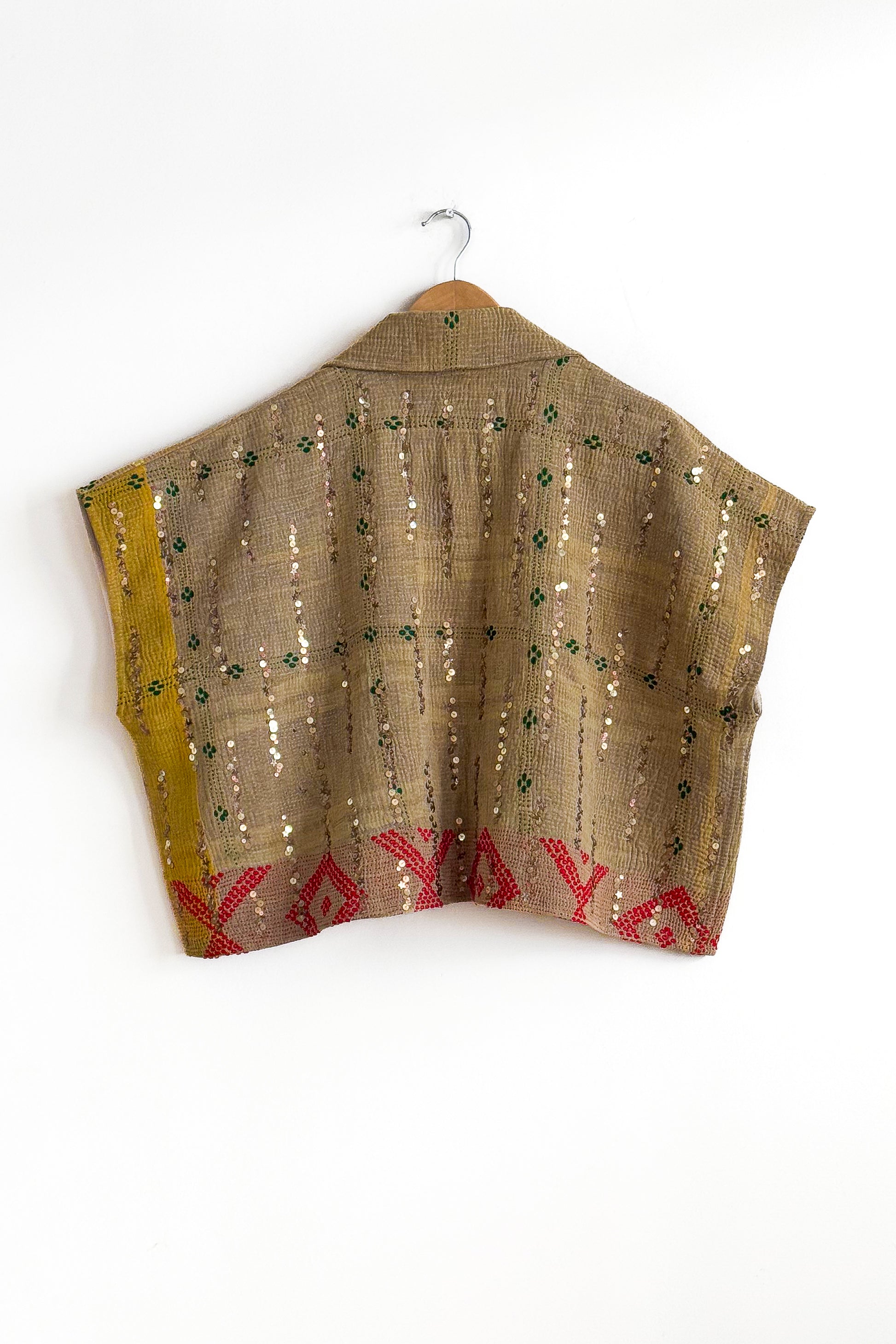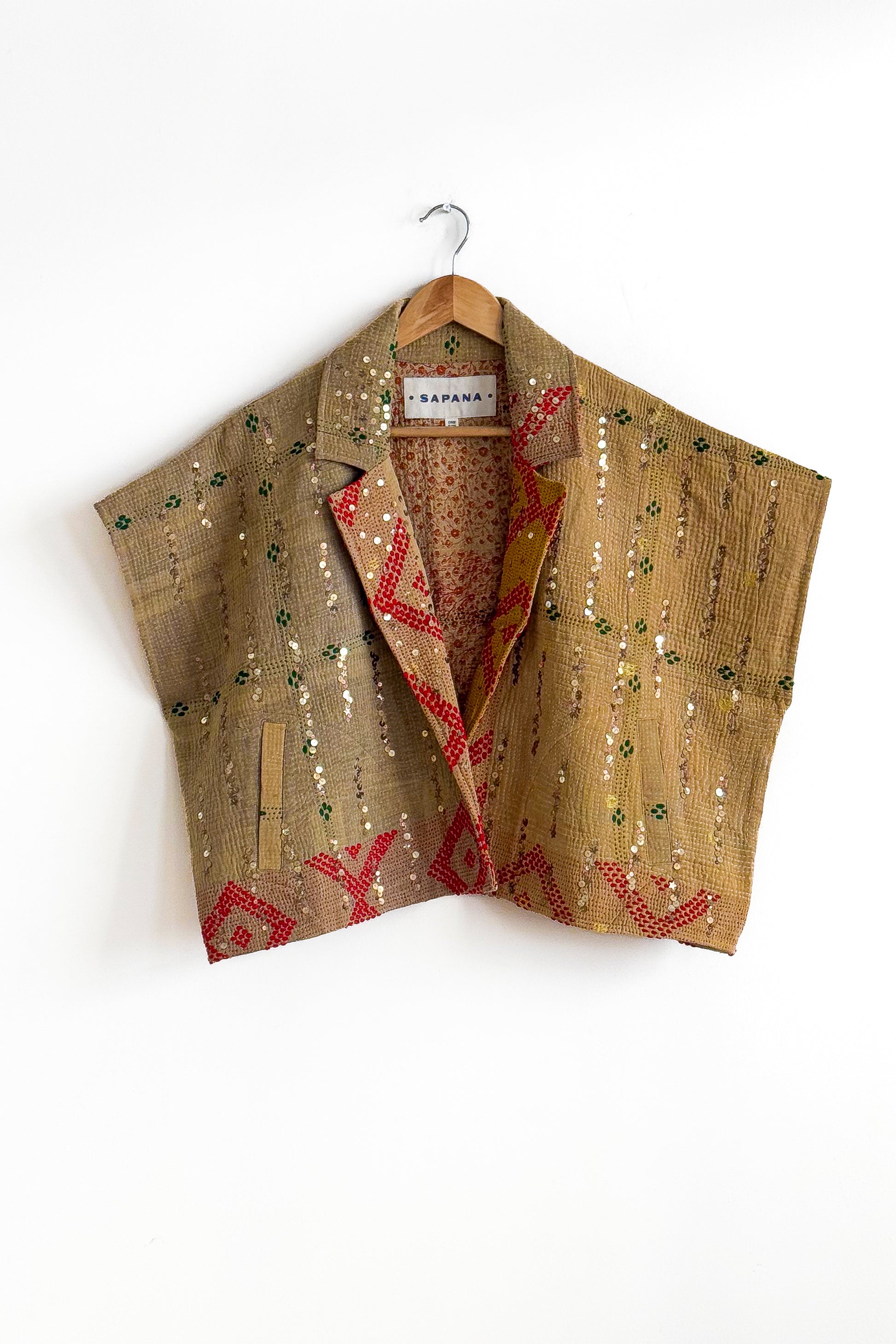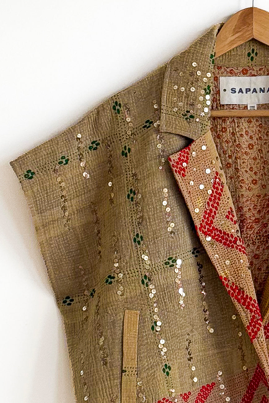 Every coat is one of a kind, made from a vintage kantha quilt. Layers of fabric bound by a hand sewn running stitch - your piece may have markings or worn areas that we find make our coats even more storied and unique.