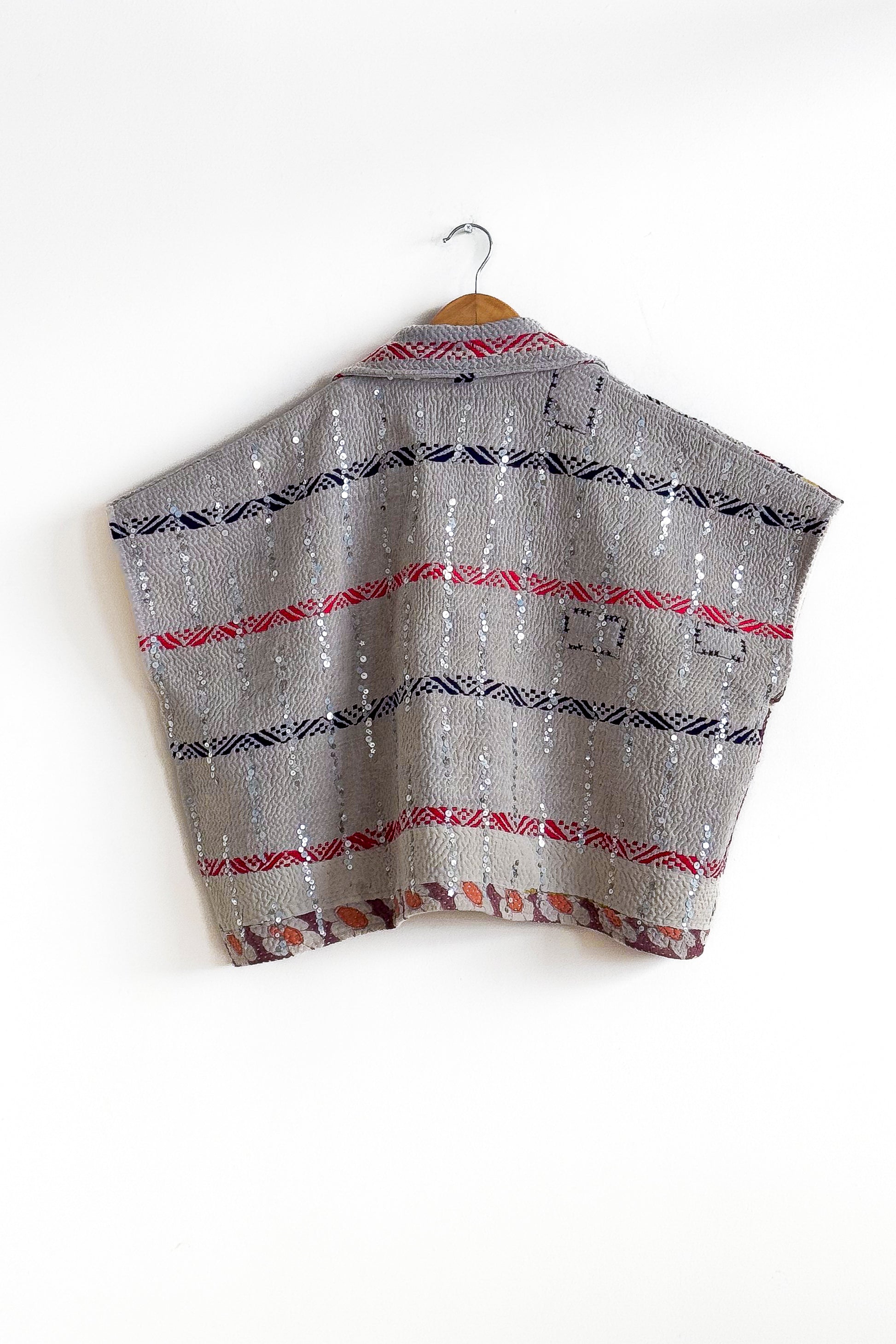 Every coat is one of a kind, made from a vintage kantha quilt. Layers of fabric bound by a hand sewn running stitch - your piece may have markings or worn areas that we find make our coats even more storied and unique.