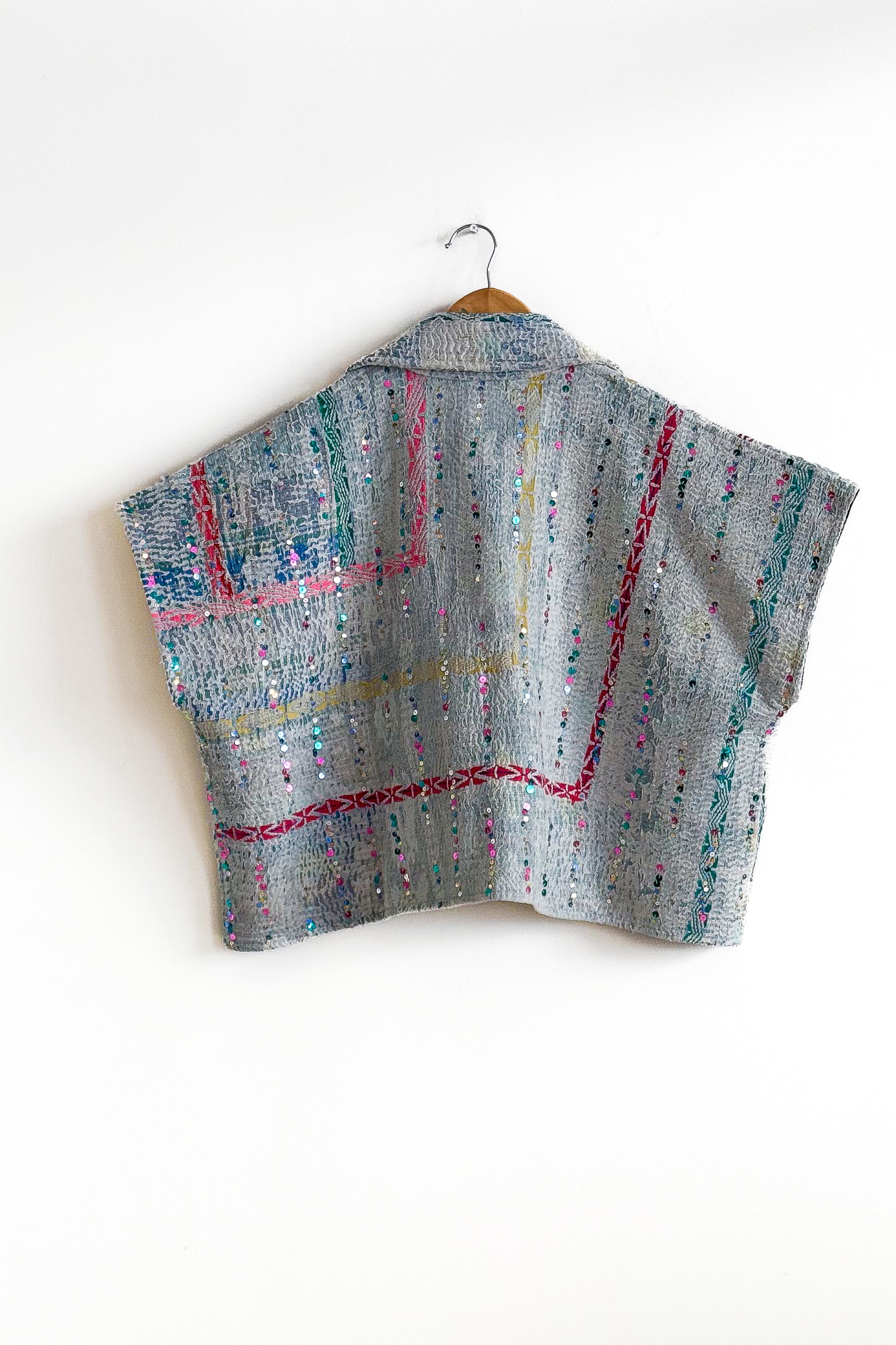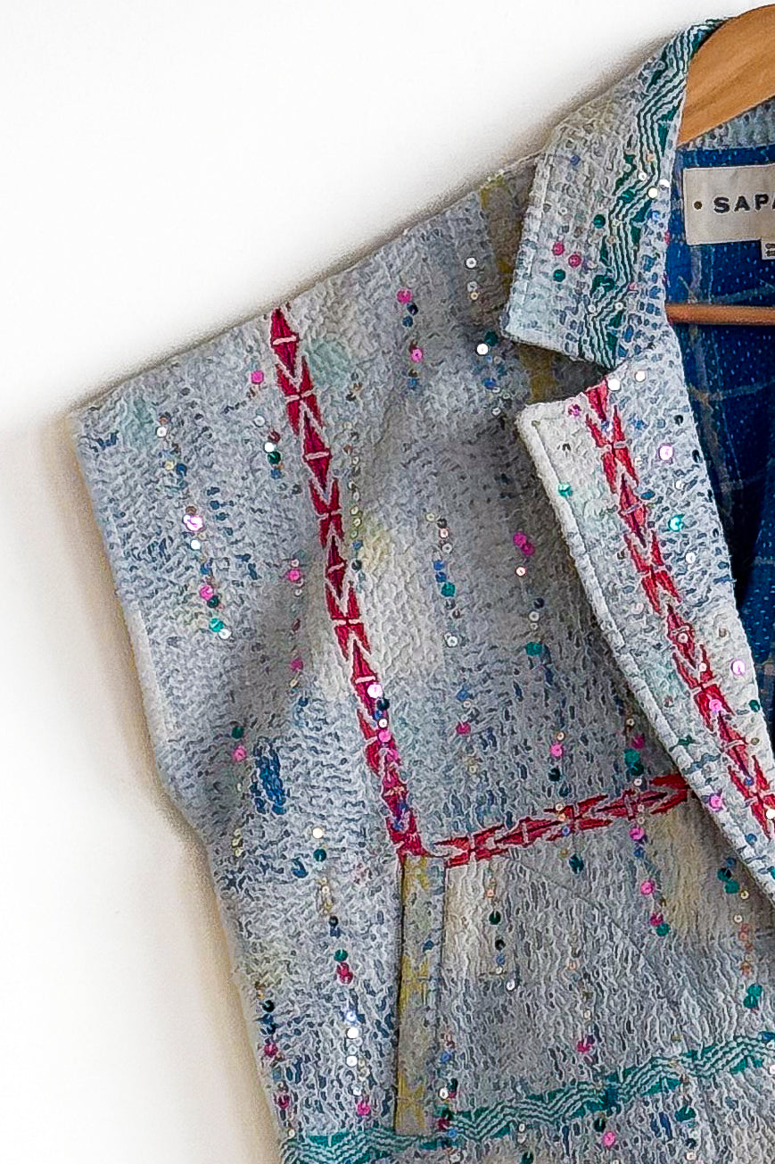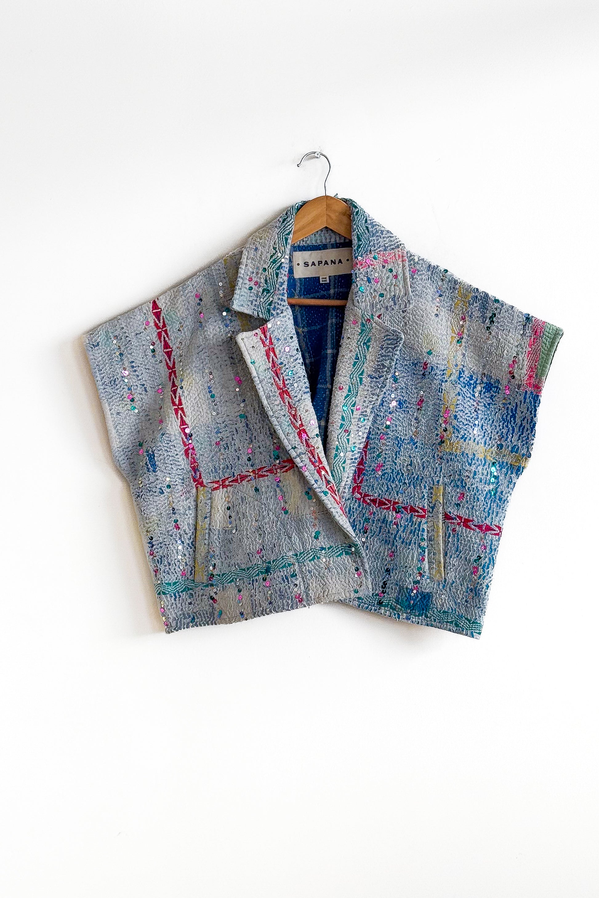 Every coat is one of a kind, made from a vintage kantha quilt. Layers of fabric bound by a hand sewn running stitch - your piece may have markings or worn areas that we find make our coats even more storied and unique.