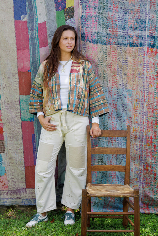 Every coat is one of a kind, made from a vintage kantha quilt. Layers of fabric bound by a hand sewn running stitch - your piece may have markings or worn areas that we find make our coats even more storied and unique.