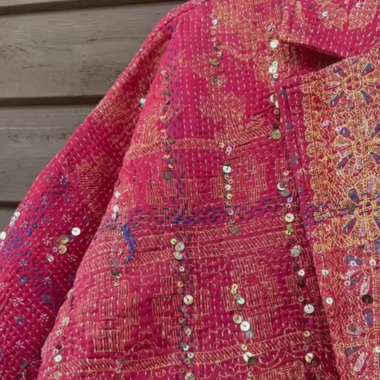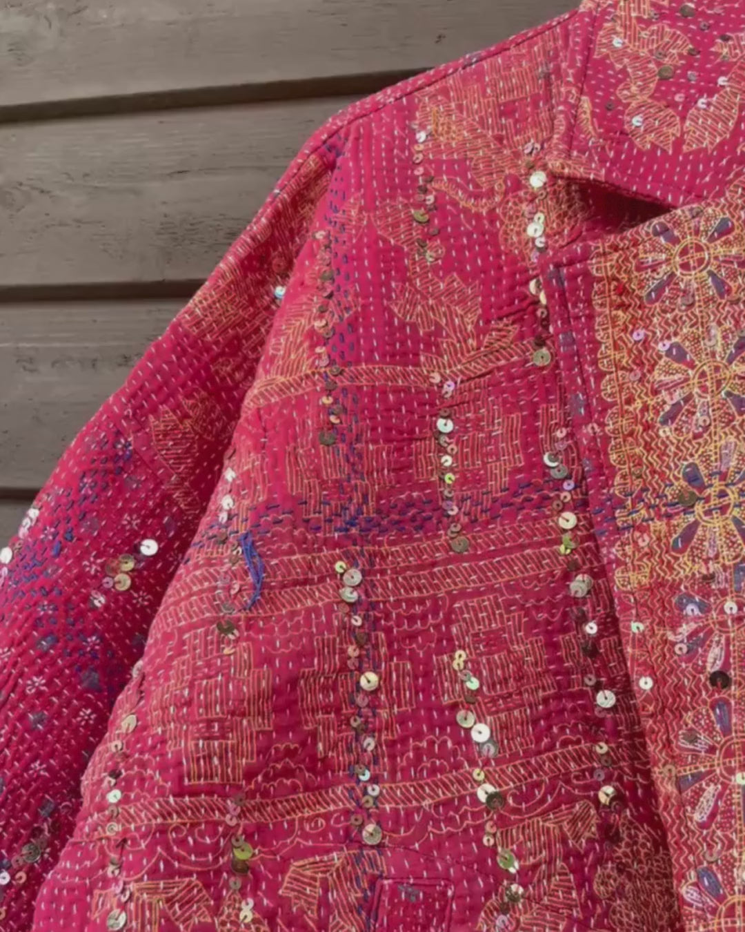 Every coat is one of a kind, made from a vintage kantha quilt. Layers of fabric bound by a hand sewn running stitch - your piece may have markings or worn areas that we find make our coats even more storied and unique.