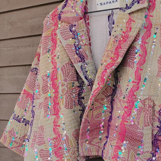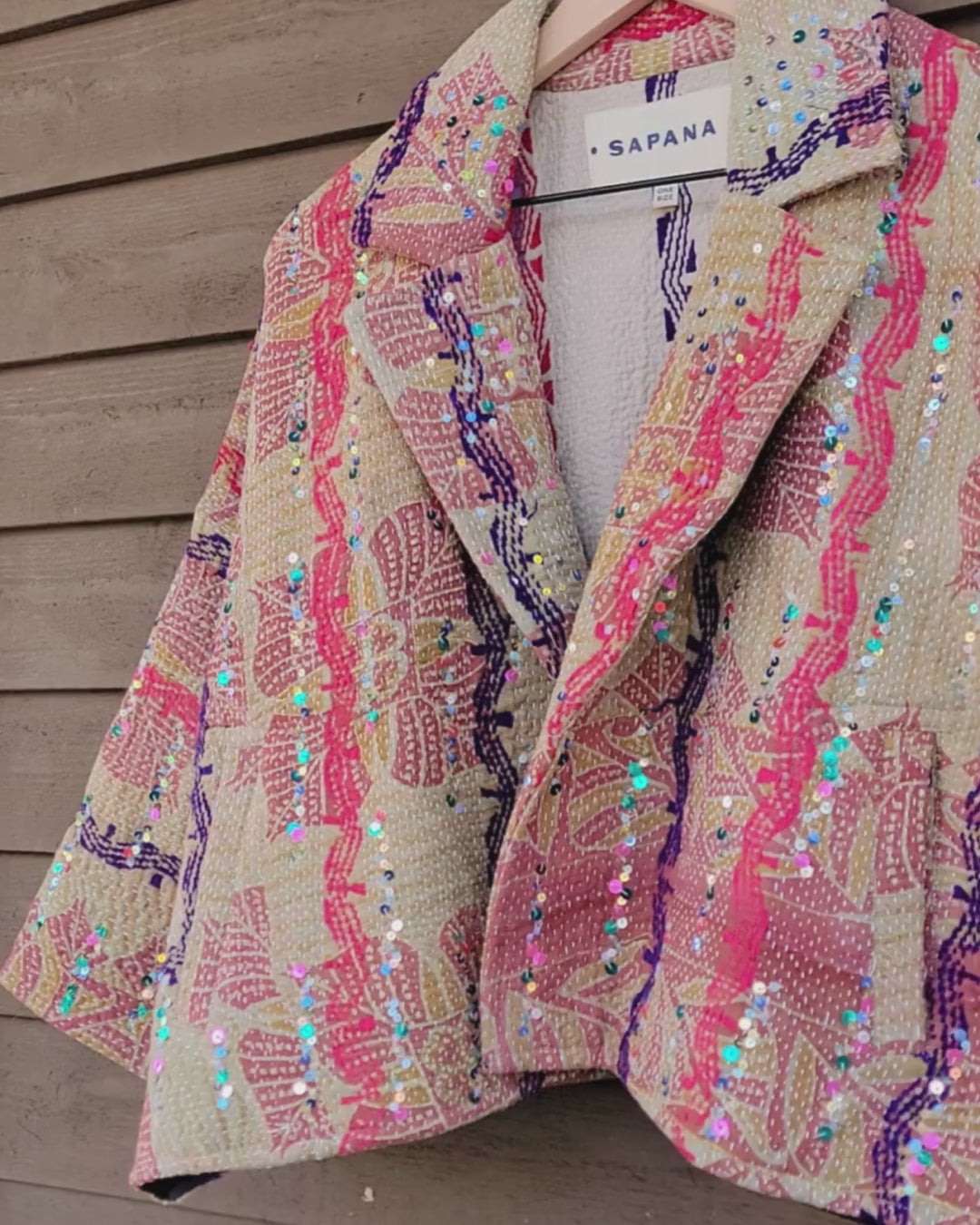 Every coat is one of a kind, made from a vintage kantha quilt. Layers of fabric bound by a hand sewn running stitch - your piece may have markings or worn areas that we find make our coats even more storied and unique.