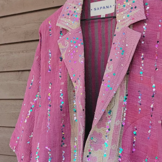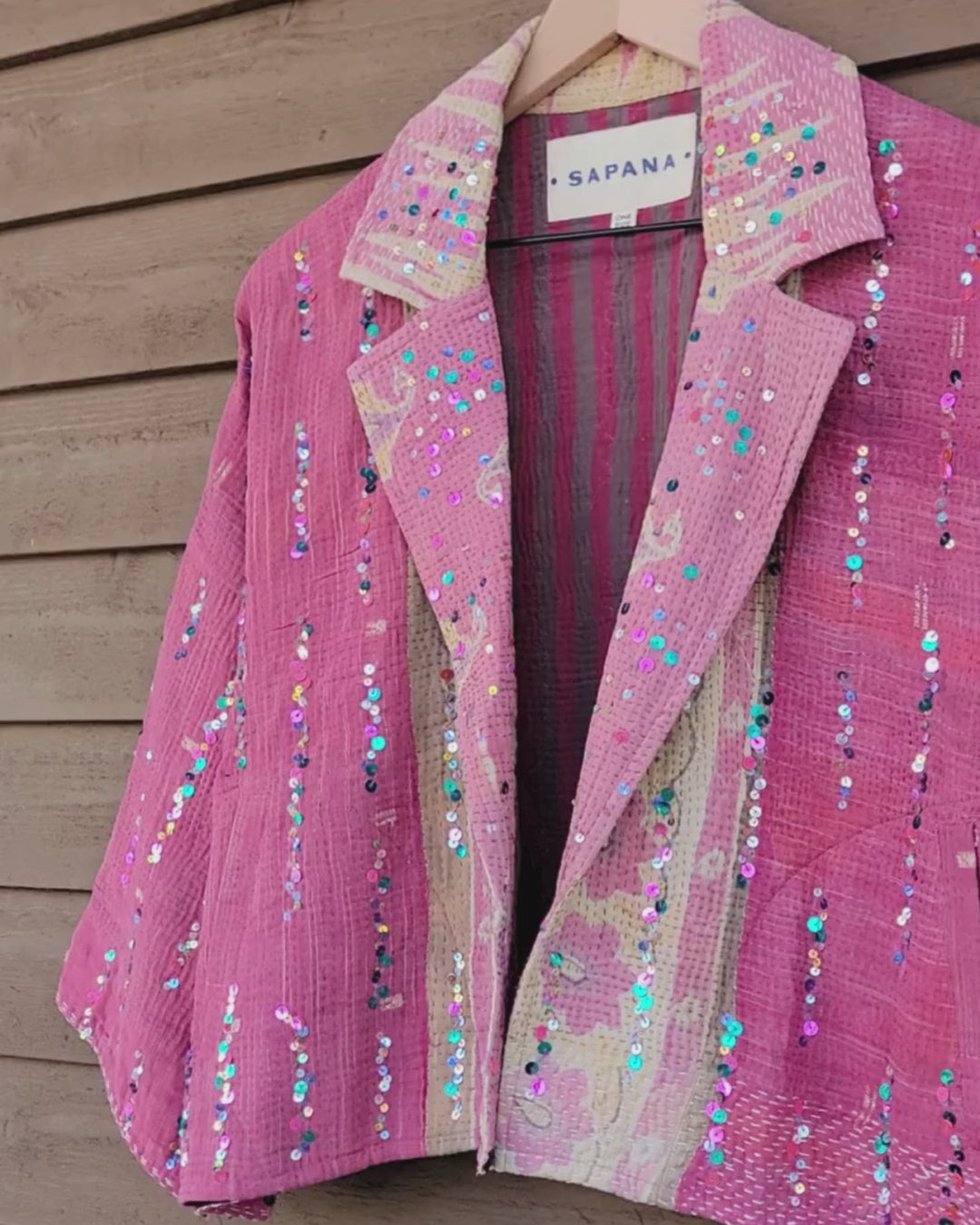 Every coat is one of a kind, made from a vintage kantha quilt. Layers of fabric bound by a hand sewn running stitch - your piece may have markings or worn areas that we find make our coats even more storied and unique.