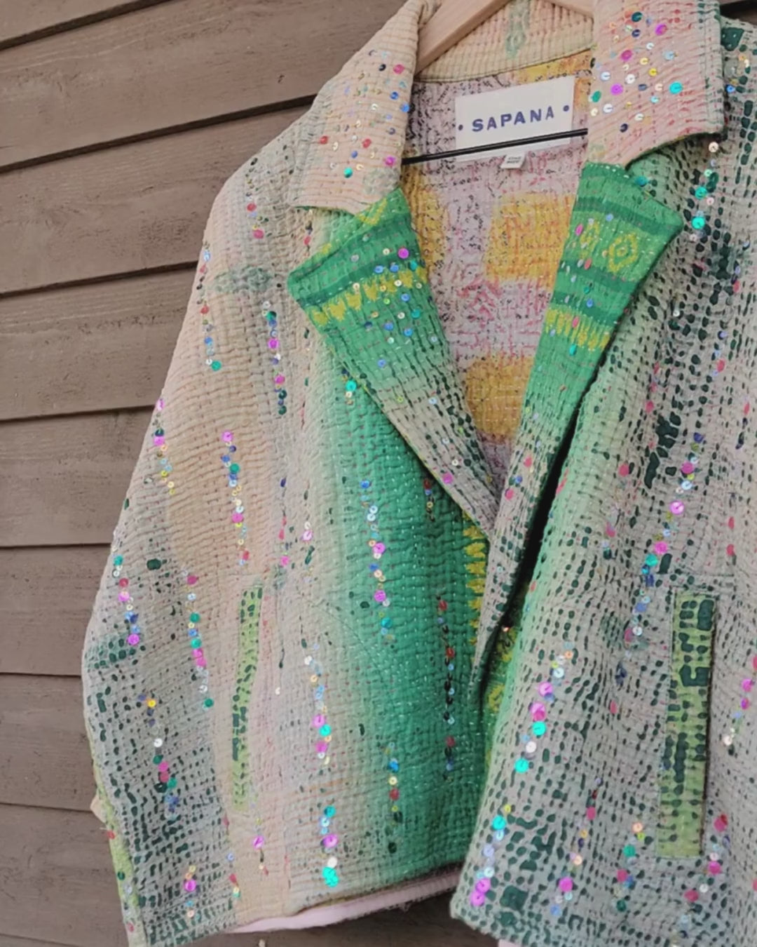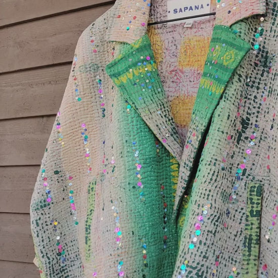 Every coat is one of a kind, made from a vintage kantha quilt. Layers of fabric bound by a hand sewn running stitch - your piece may have markings or worn areas that we find make our coats even more storied and unique.