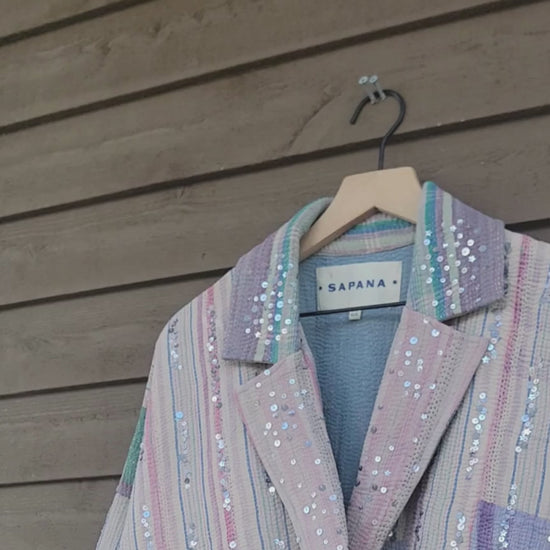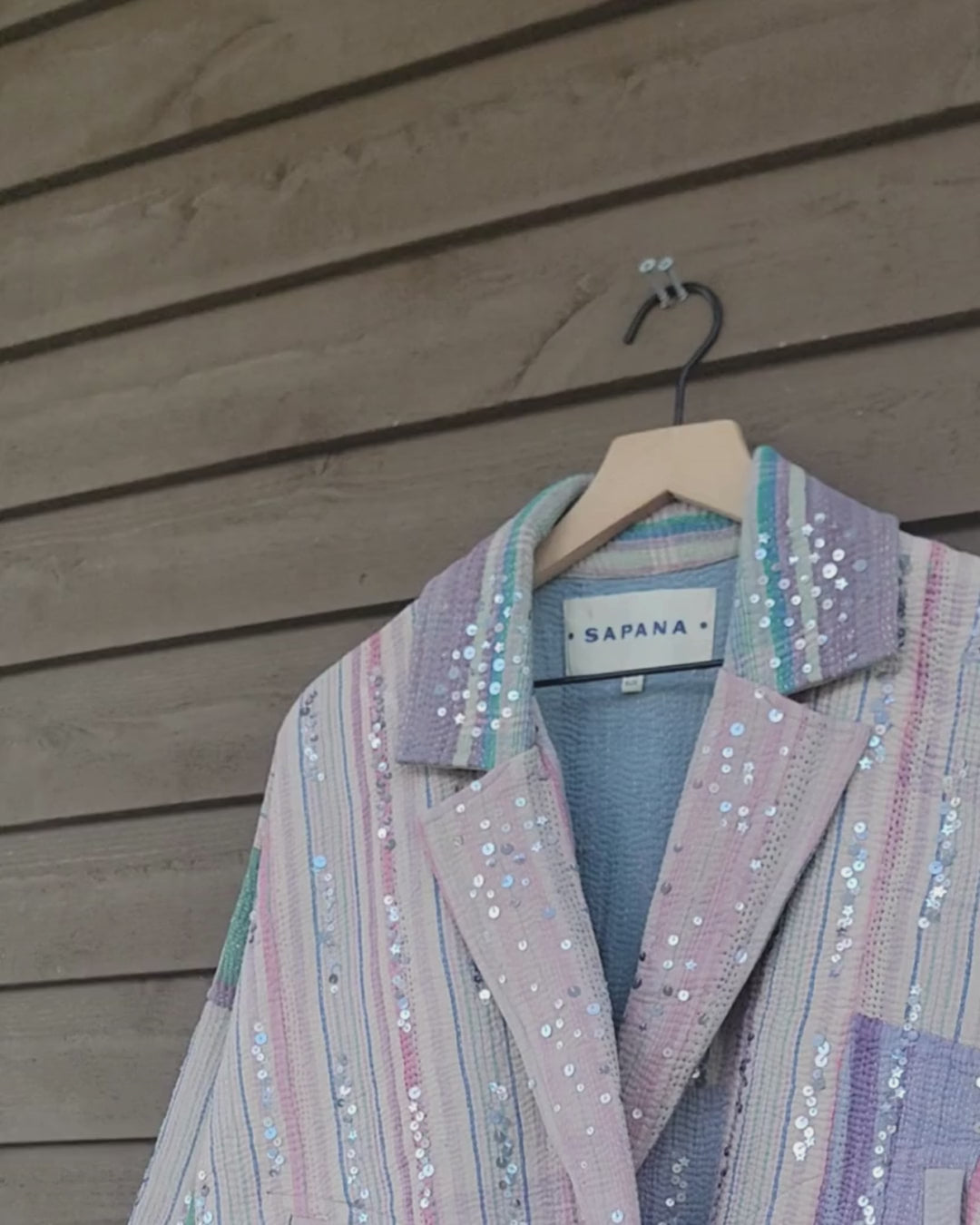 Every coat is one of a kind, made from a vintage kantha quilt. Layers of fabric bound by a hand sewn running stitch - your piece may have markings or worn areas that we find make our coats even more storied and unique.