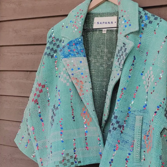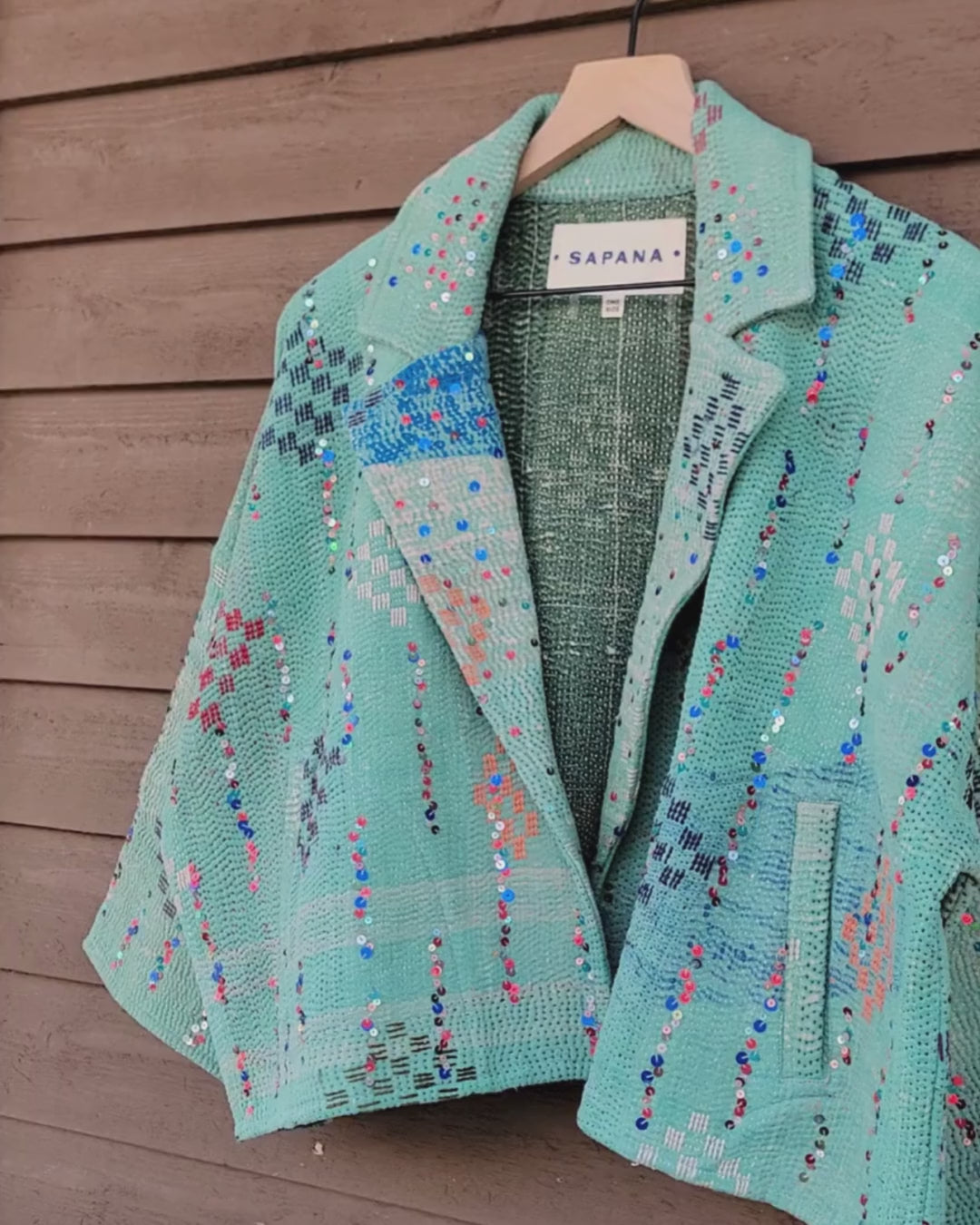 Every coat is one of a kind, made from a vintage kantha quilt. Layers of fabric bound by a hand sewn running stitch - your piece may have markings or worn areas that we find make our coats even more storied and unique.