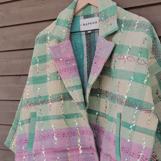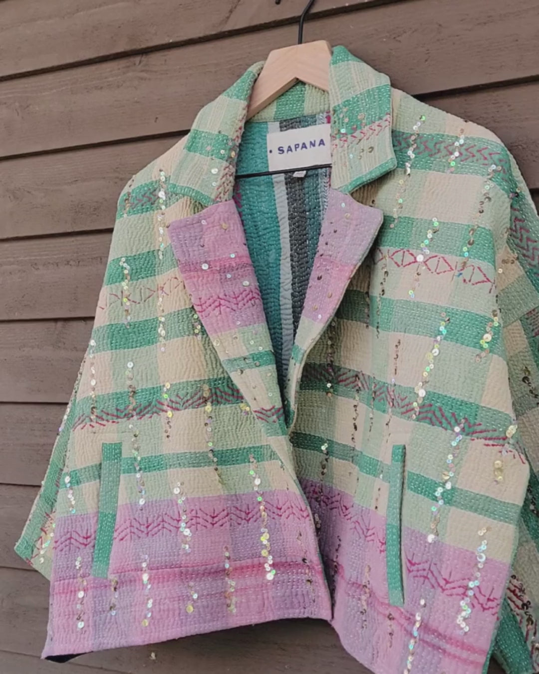 Every coat is one of a kind, made from a vintage kantha quilt. Layers of fabric bound by a hand sewn running stitch - your piece may have markings or worn areas that we find make our coats even more storied and unique.