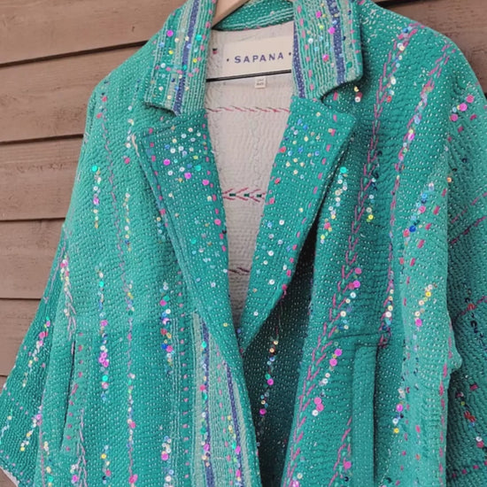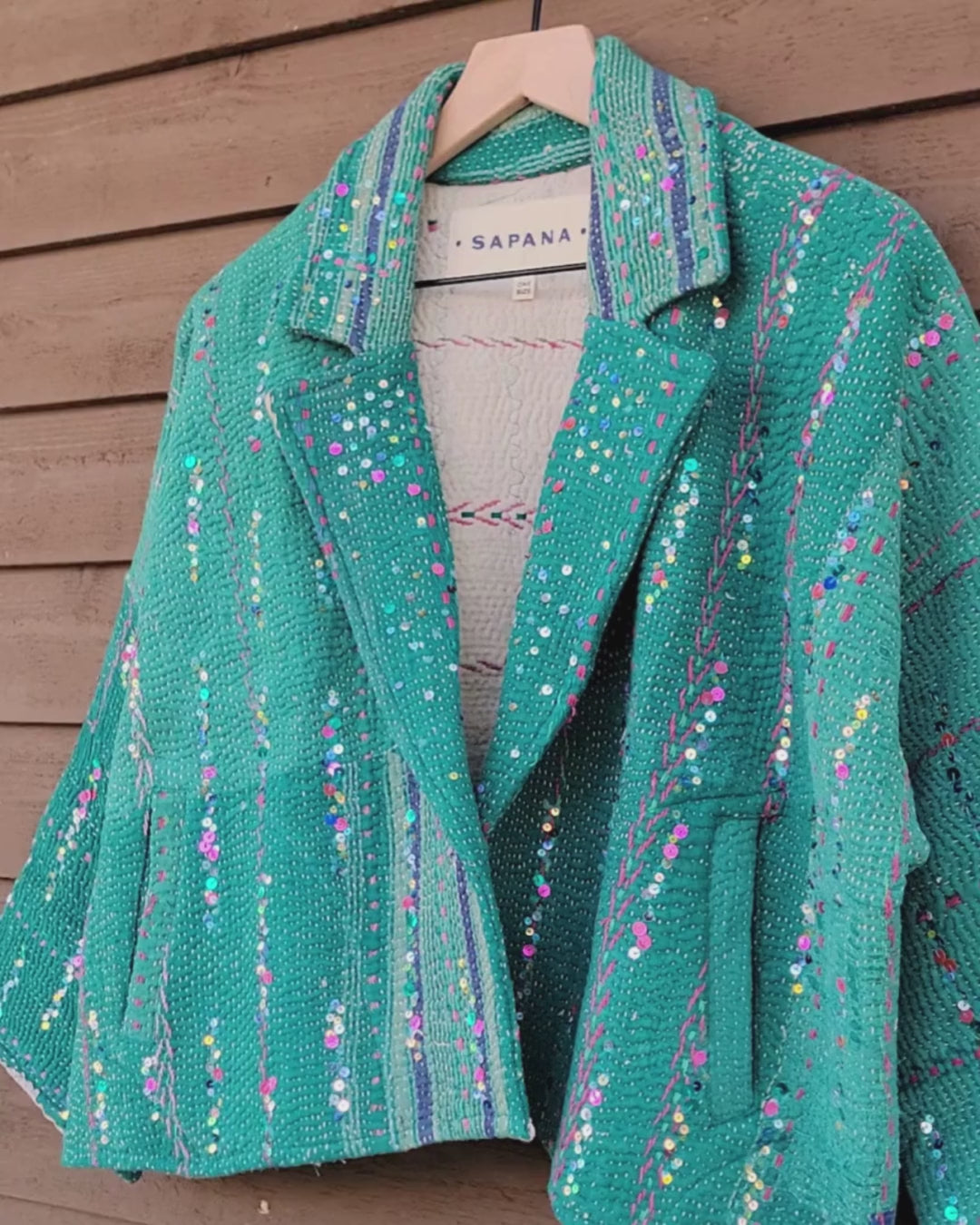Every coat is one of a kind, made from a vintage kantha quilt. Layers of fabric bound by a hand sewn running stitch - your piece may have markings or worn areas that we find make our coats even more storied and unique.