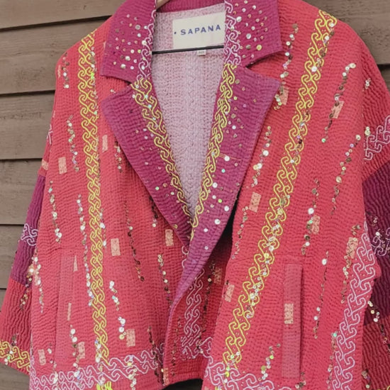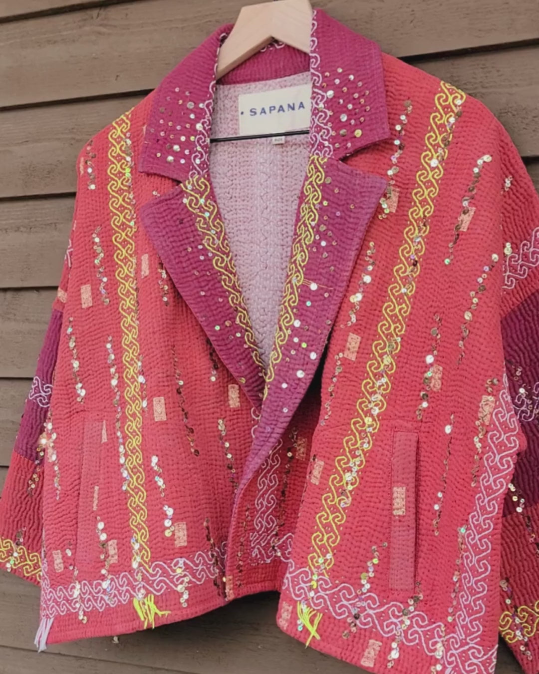 Every coat is one of a kind, made from a vintage kantha quilt. Layers of fabric bound by a hand sewn running stitch - your piece may have markings or worn areas that we find make our coats even more storied and unique.