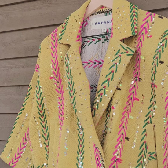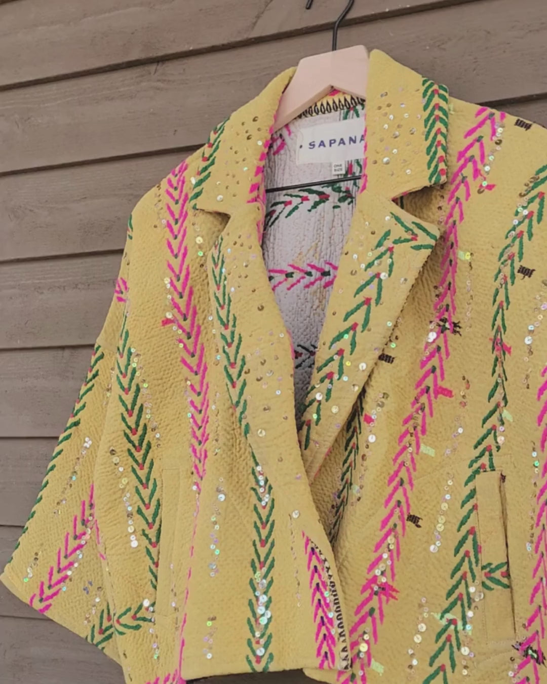Every coat is one of a kind, made from a vintage kantha quilt. Layers of fabric bound by a hand sewn running stitch - your piece may have markings or worn areas that we find make our coats even more storied and unique.