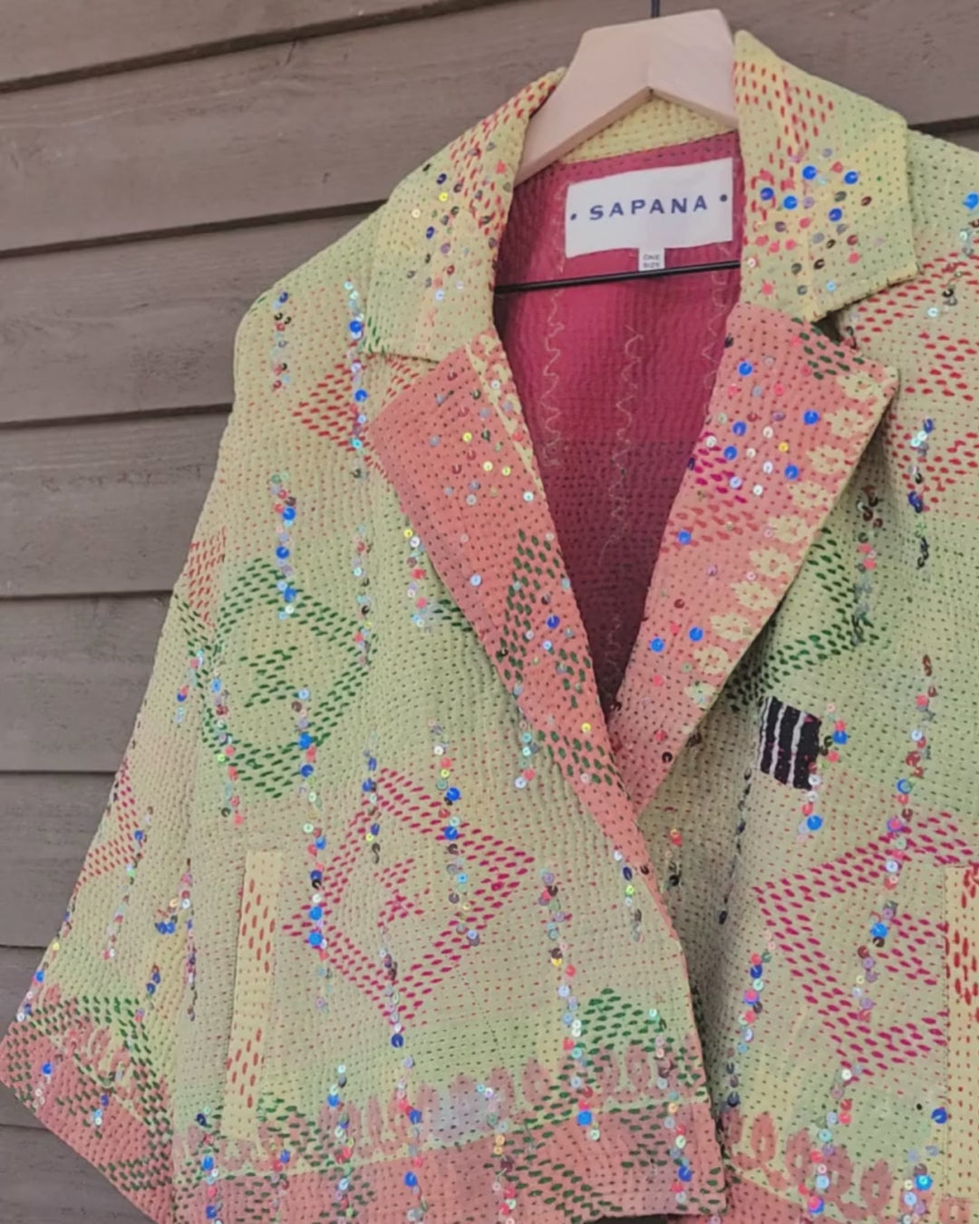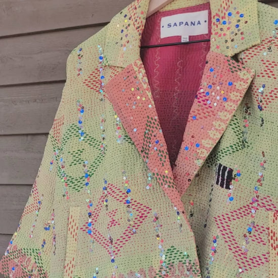 Every coat is one of a kind, made from a vintage kantha quilt. Layers of fabric bound by a hand sewn running stitch - your piece may have markings or worn areas that we find make our coats even more storied and unique.