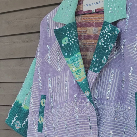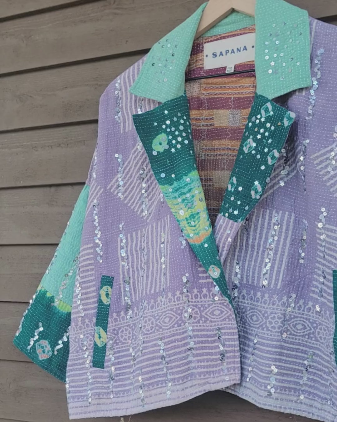 Every coat is one of a kind, made from a vintage kantha quilt. Layers of fabric bound by a hand sewn running stitch - your piece may have markings or worn areas that we find make our coats even more storied and unique.