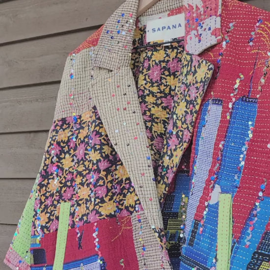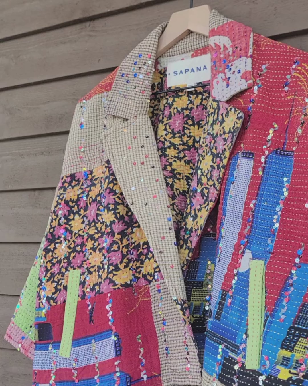 Every coat is one of a kind, made from a vintage kantha quilt. Layers of fabric bound by a hand sewn running stitch - your piece may have markings or worn areas that we find make our coats even more storied and unique.