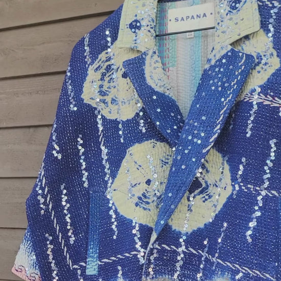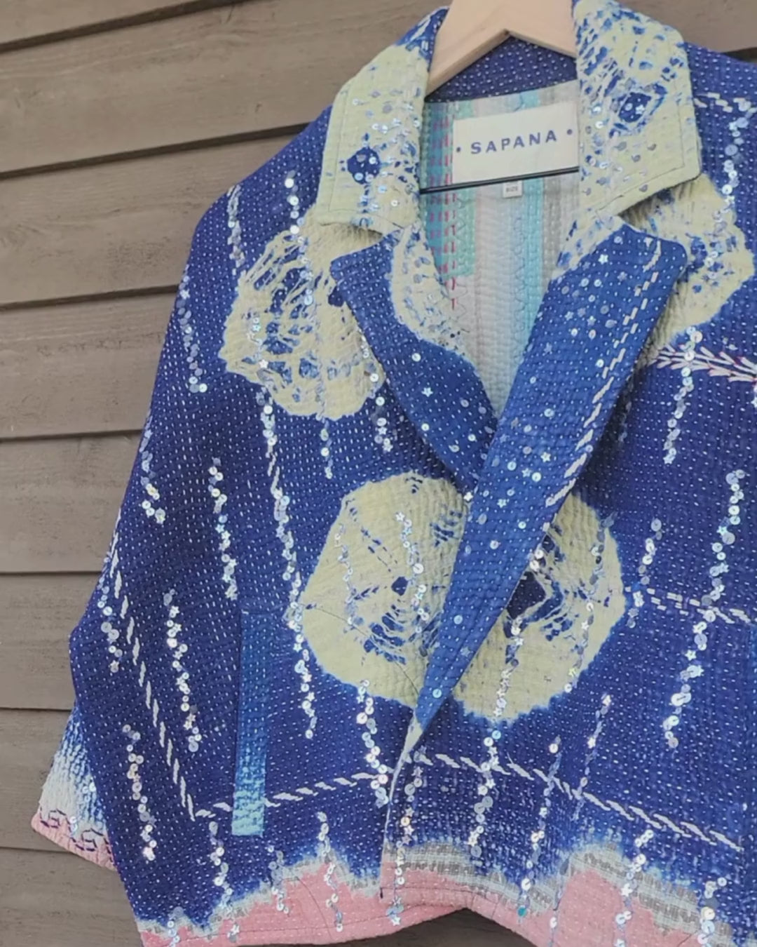 Every coat is one of a kind, made from a vintage kantha quilt. Layers of fabric bound by a hand sewn running stitch - your piece may have markings or worn areas that we find make our coats even more storied and unique.