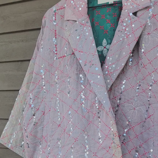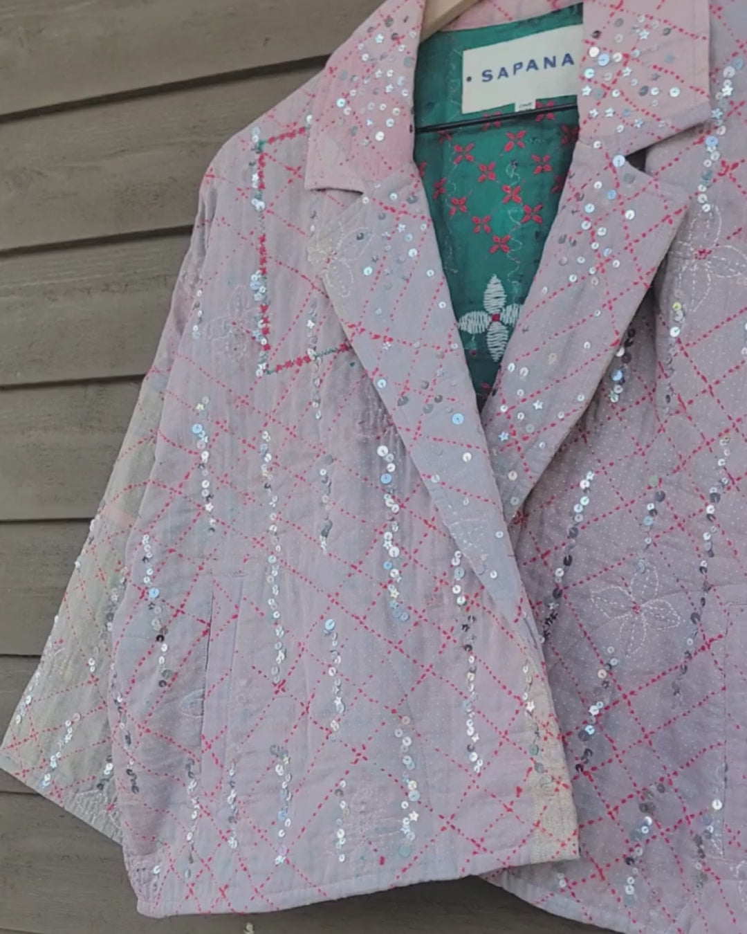 Every coat is one of a kind, made from a vintage kantha quilt. Layers of fabric bound by a hand sewn running stitch - your piece may have markings or worn areas that we find make our coats even more storied and unique.