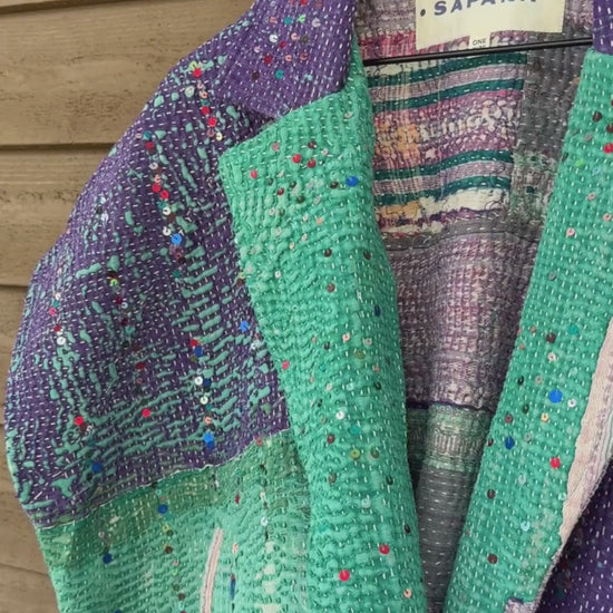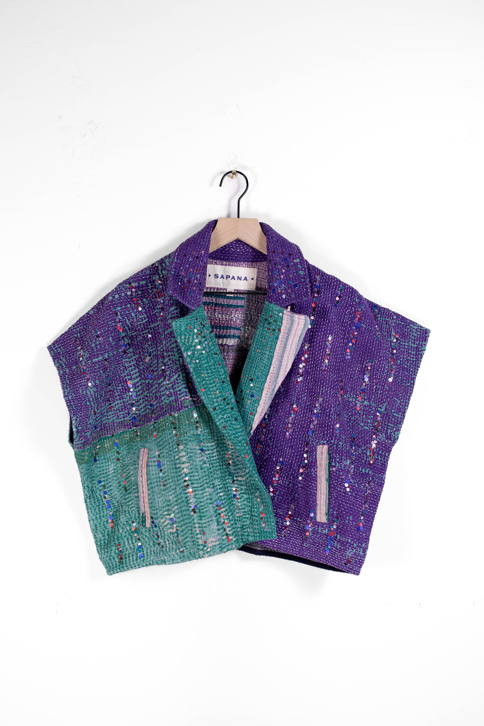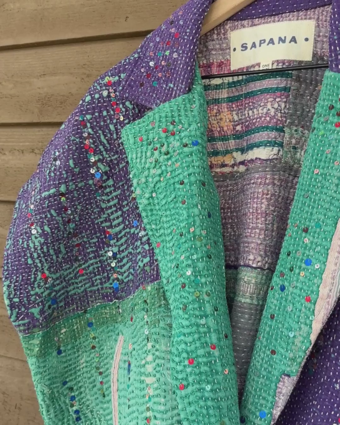 The Tara Crop was made for nights that start slow and end with stars. It’s our signature cropped silhouette—simple, versatile, and stitched from vintage kantha quilts—but elevated with sequins, hand-applied in a broken, shimmering rhythm that nods to traditional kantha stitching. Not too much. Just enough.