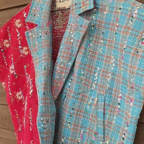 Every coat is one of a kind, made from a vintage kantha quilt. Layers of fabric bound by a hand sewn running stitch - your piece may have markings or worn areas that we find make our coats even more storied and unique.