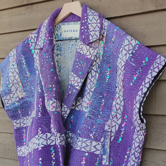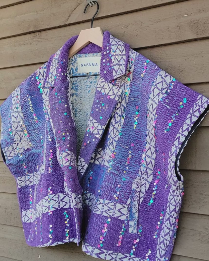 Every coat is one of a kind, made from a vintage kantha quilt. Layers of fabric bound by a hand sewn running stitch - your piece may have markings or worn areas that we find make our coats even more storied and unique.