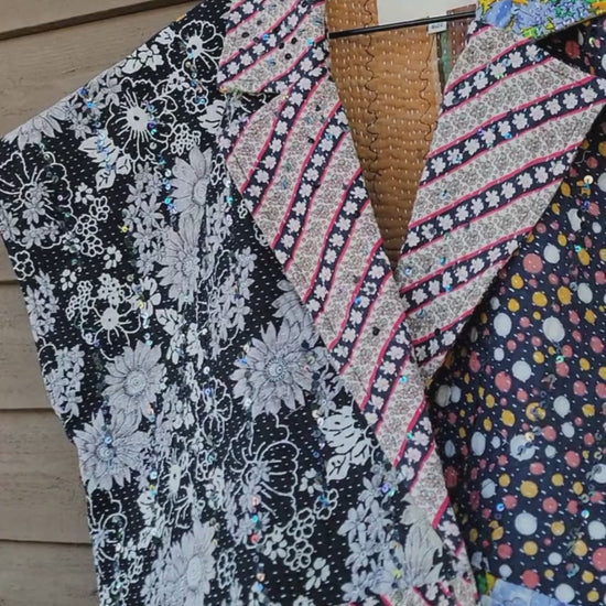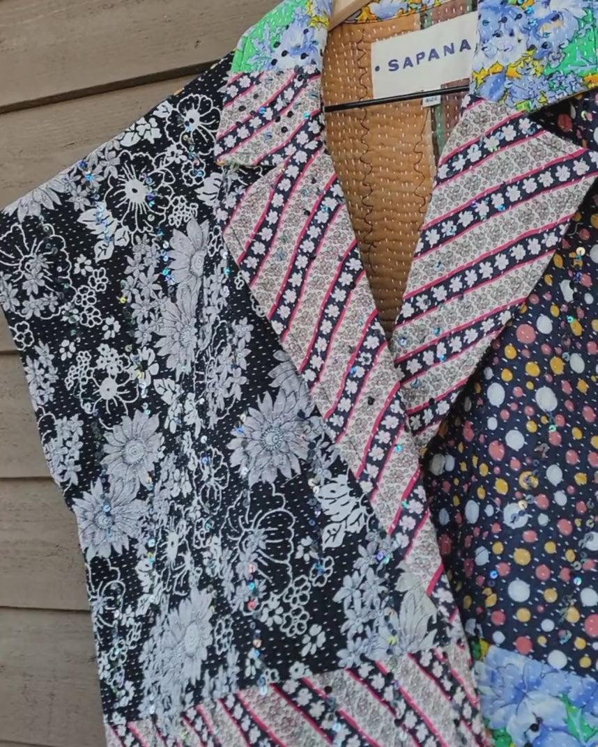 Every coat is one of a kind, made from a vintage kantha quilt. Layers of fabric bound by a hand sewn running stitch - your piece may have markings or worn areas that we find make our coats even more storied and unique.