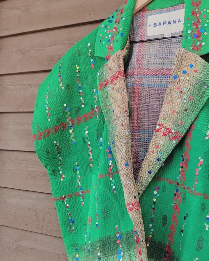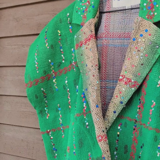 Every coat is one of a kind, made from a vintage kantha quilt. Layers of fabric bound by a hand sewn running stitch - your piece may have markings or worn areas that we find make our coats even more storied and unique.