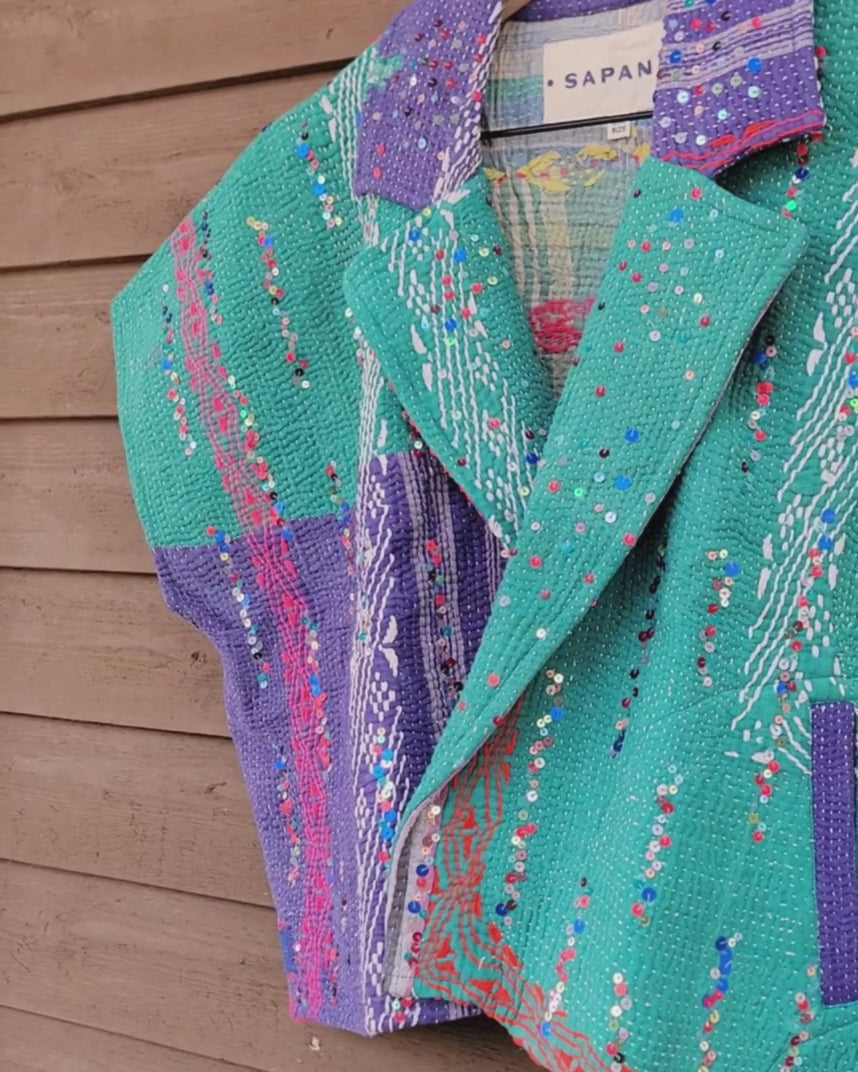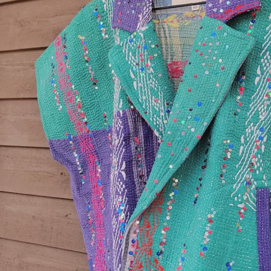 Every coat is one of a kind, made from a vintage kantha quilt. Layers of fabric bound by a hand sewn running stitch - your piece may have markings or worn areas that we find make our coats even more storied and unique.