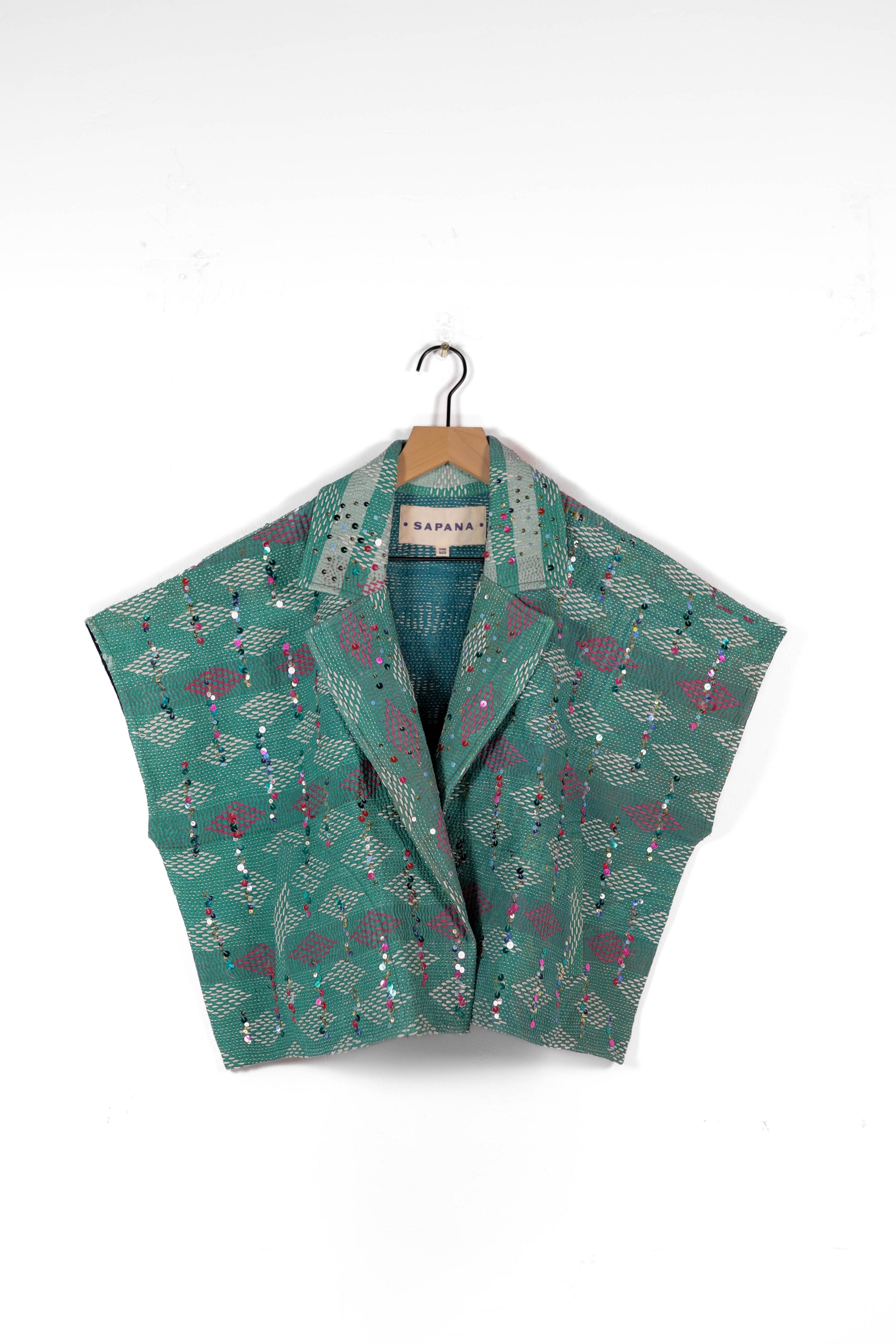 Every coat is one of a kind, made from a vintage kantha quilt. Layers of fabric bound by a hand sewn running stitch - your piece may have markings or worn areas that we find make our coats even more storied and unique.