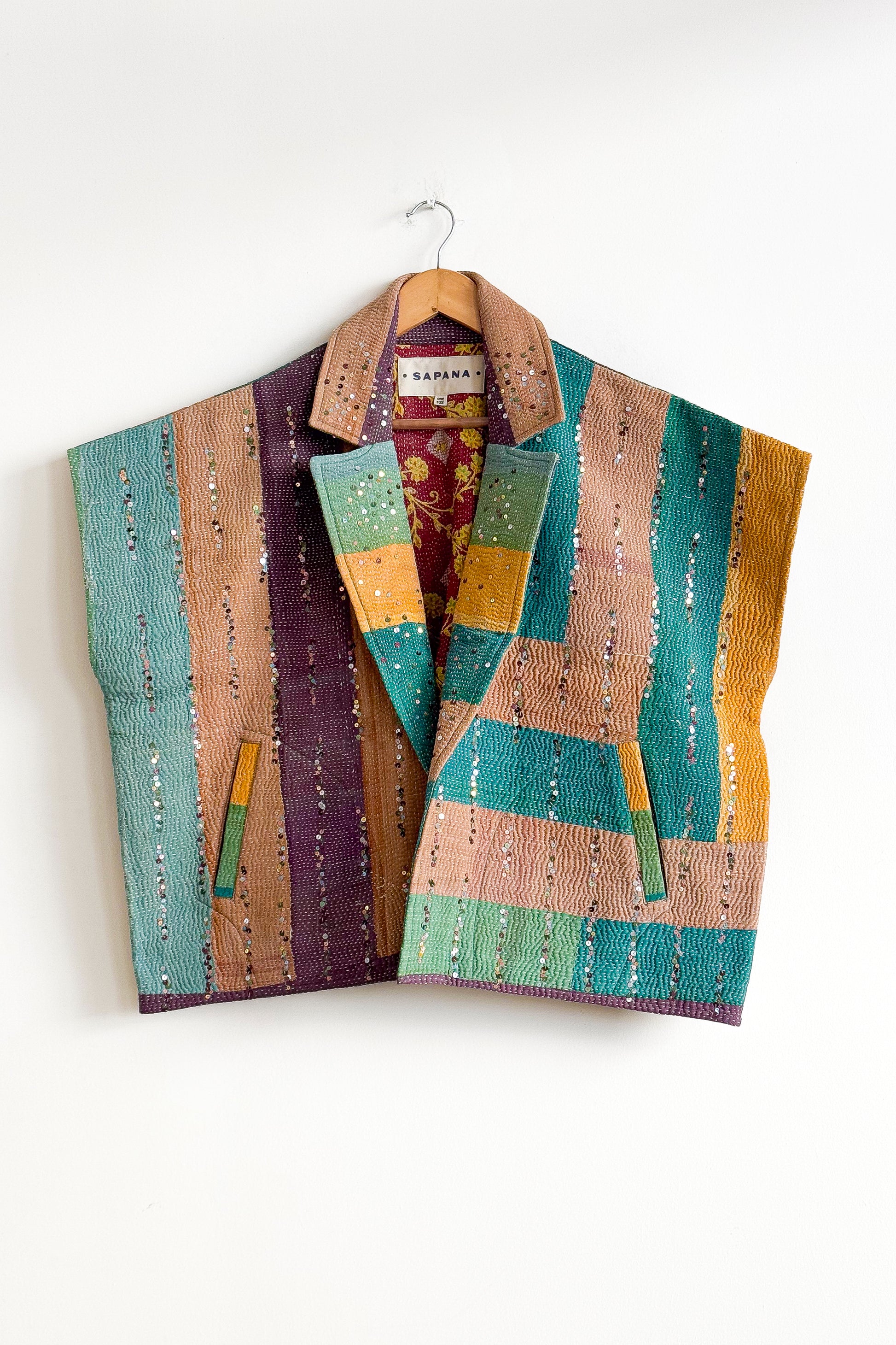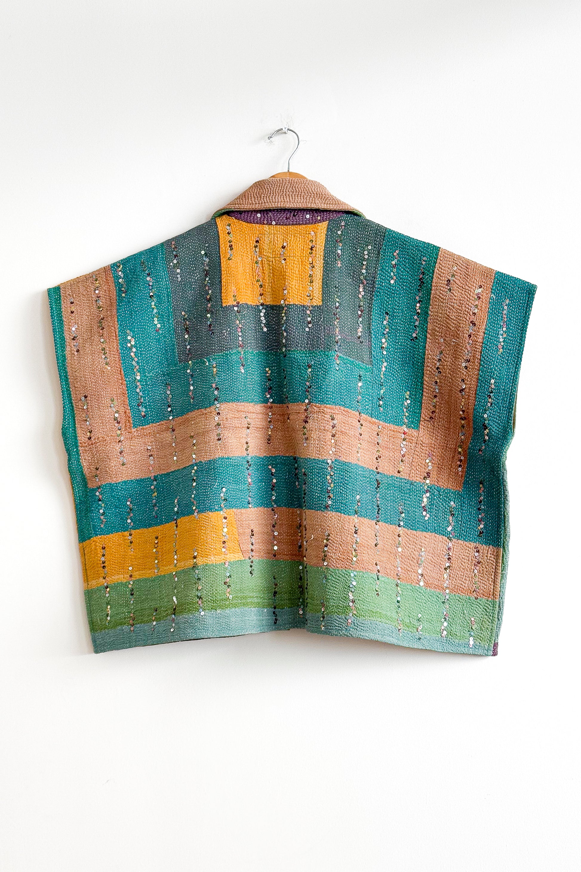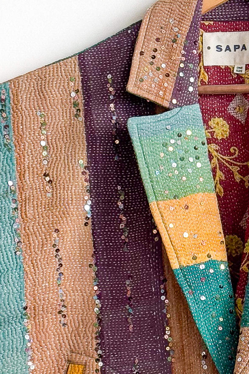 Every coat is one of a kind, made from a vintage kantha quilt. Layers of fabric bound by a hand sewn running stitch - your piece may have markings or worn areas that we find make our coats even more storied and unique.