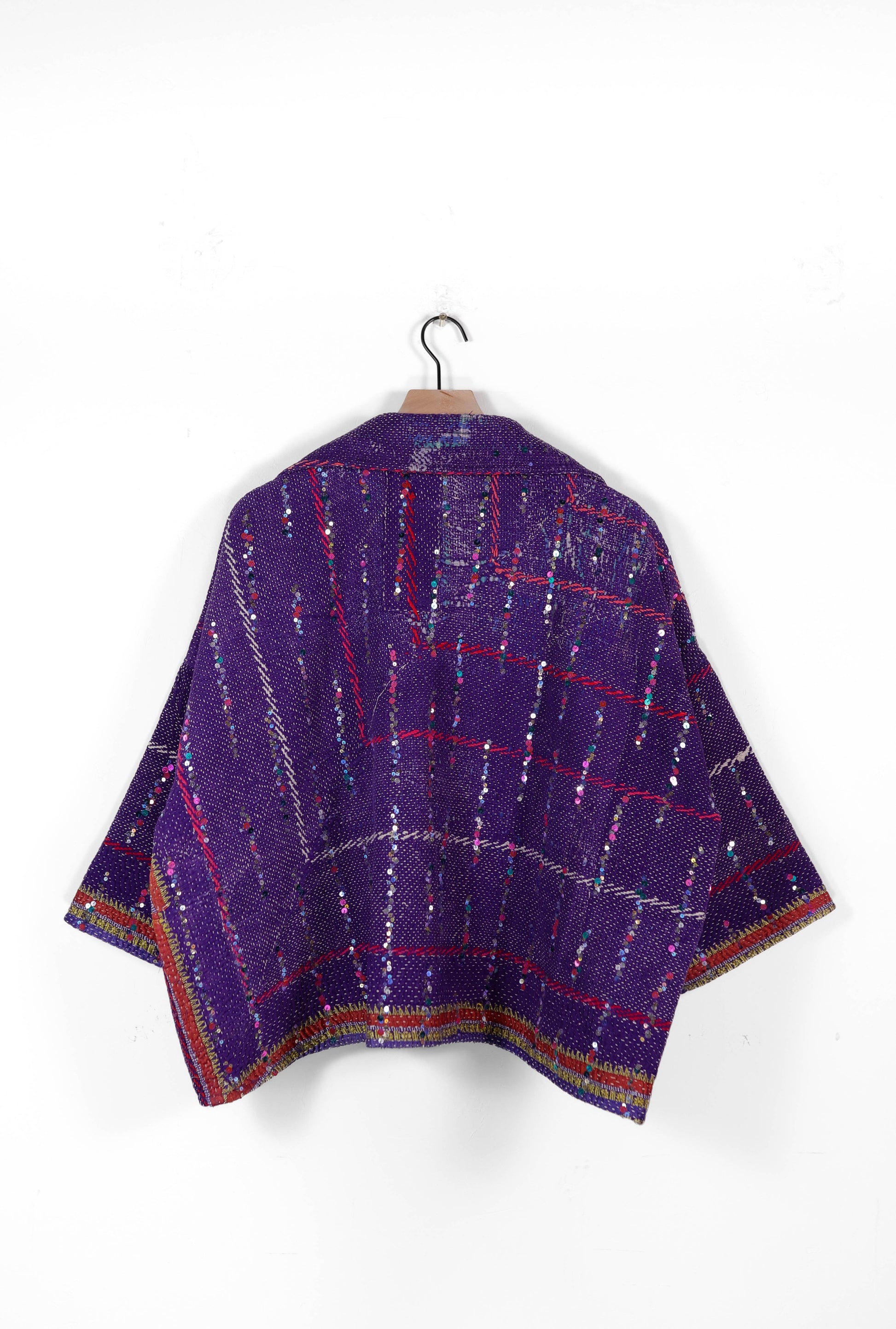 Every coat is one of a kind, made from a vintage kantha quilt. Layers of fabric bound by a hand sewn running stitch - your piece may have markings or worn areas that we find make our coats even more storied and unique.