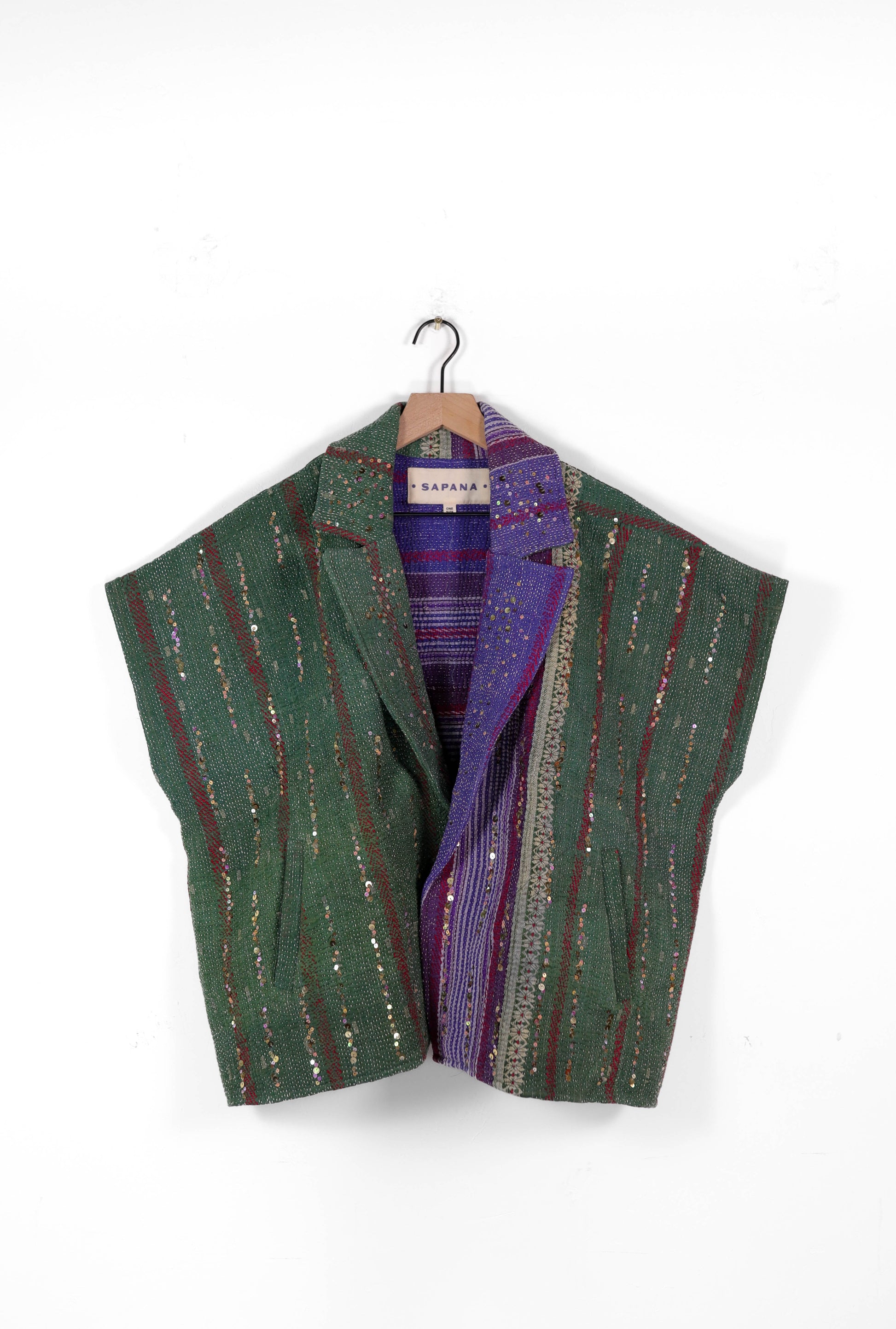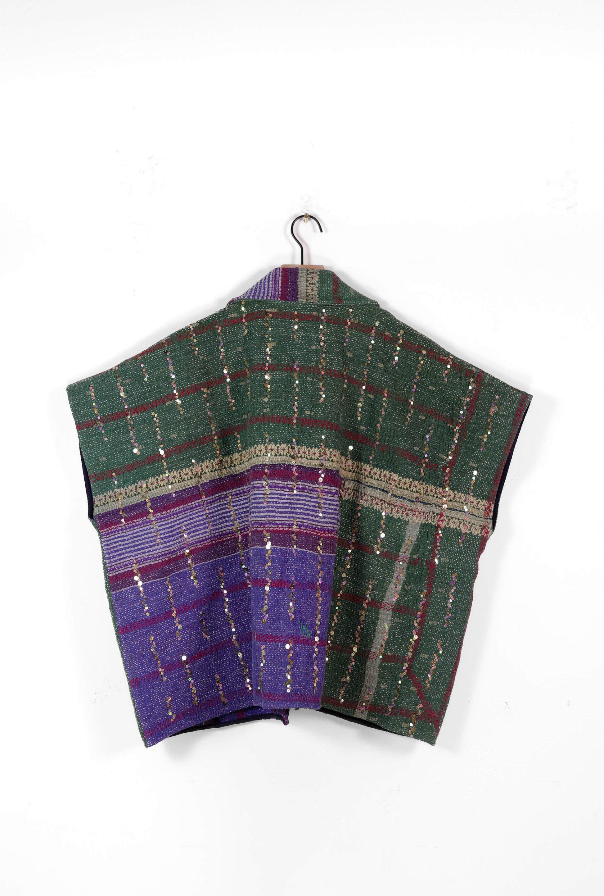 Every coat is one of a kind, made from a vintage kantha quilt. Layers of fabric bound by a hand sewn running stitch - your piece may have markings or worn areas that we find make our coats even more storied and unique.