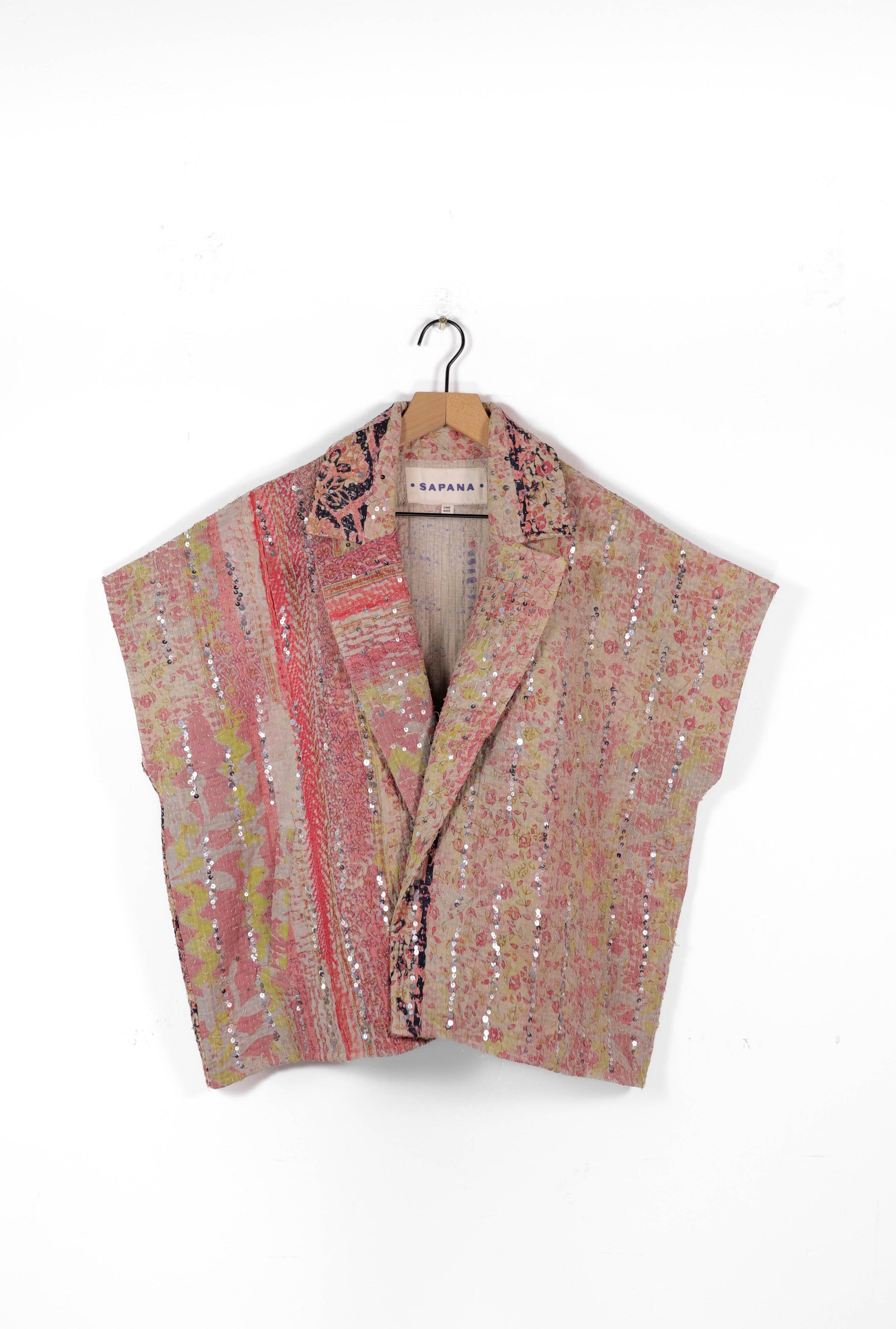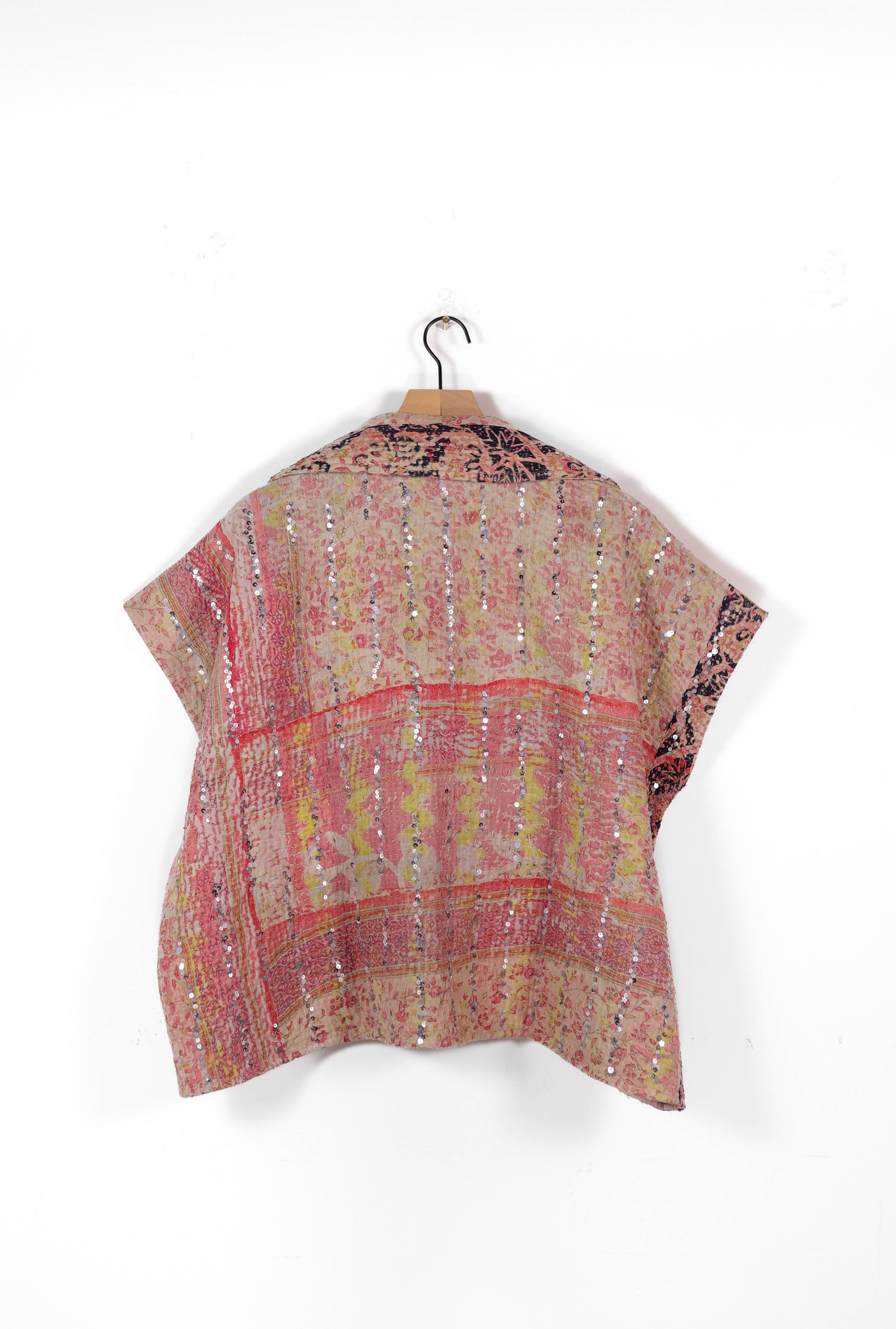 Every coat is one of a kind, made from a vintage kantha quilt. Layers of fabric bound by a hand sewn running stitch - your piece may have markings or worn areas that we find make our coats even more storied and unique.