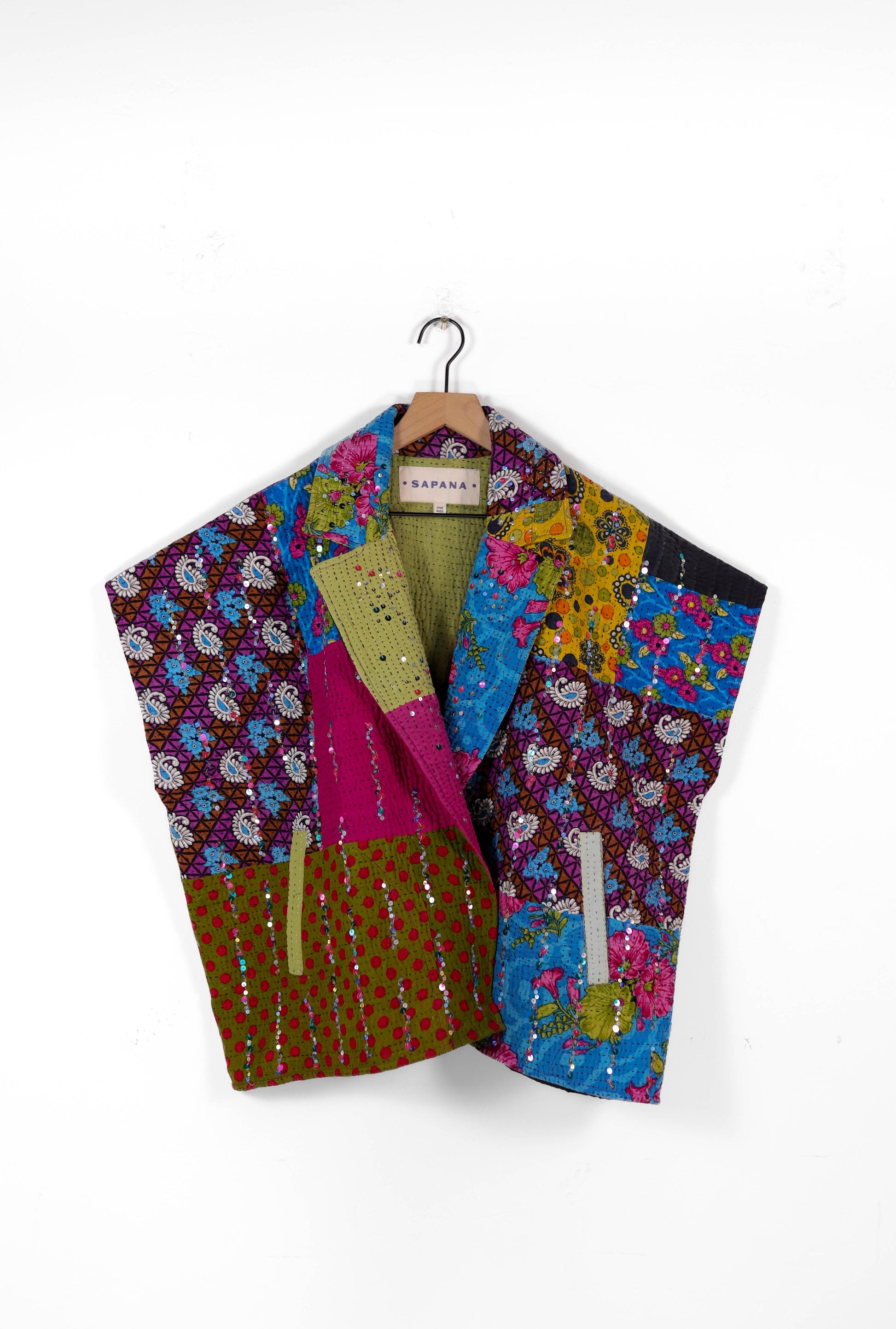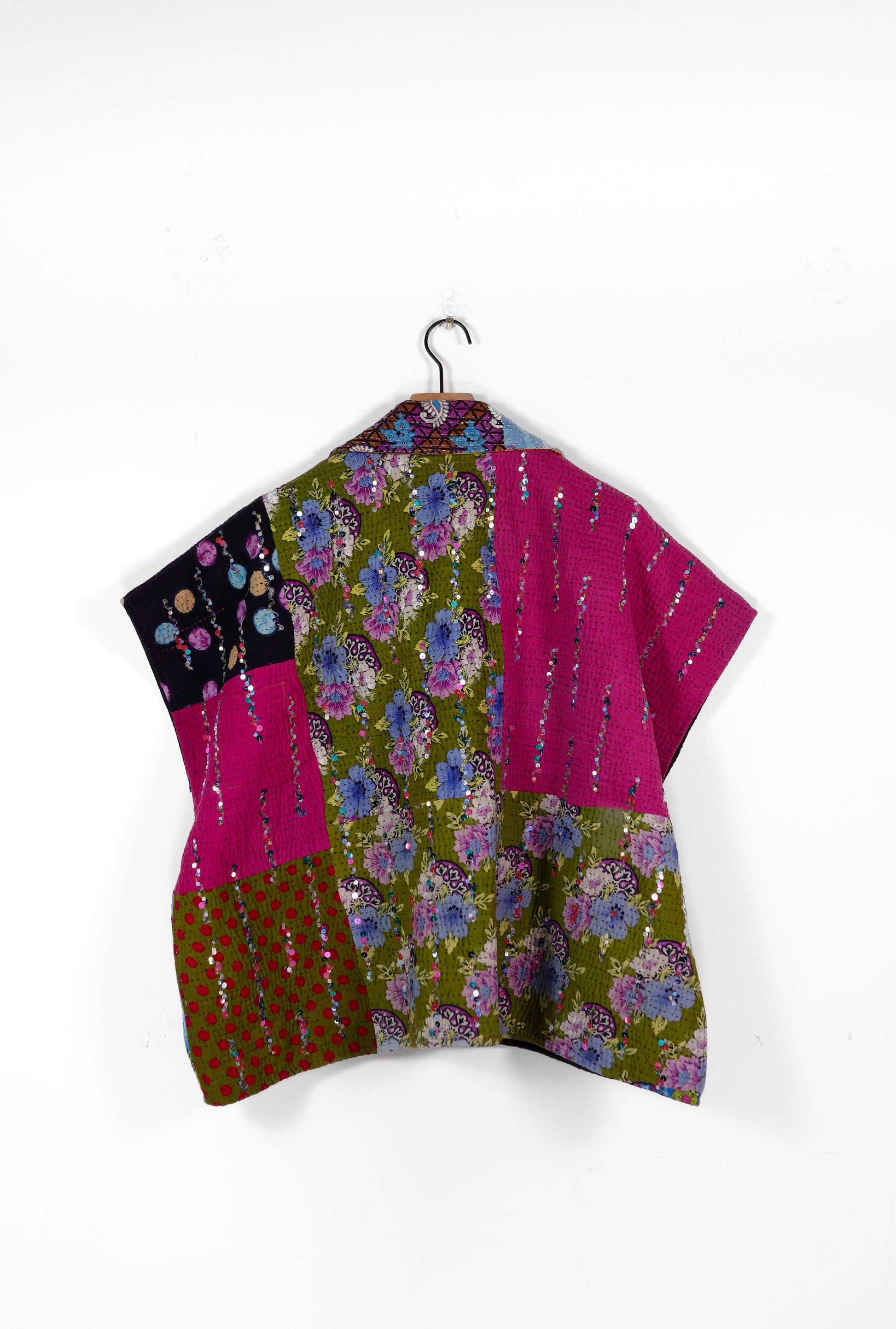Every coat is one of a kind, made from a vintage kantha quilt. Layers of fabric bound by a hand sewn running stitch - your piece may have markings or worn areas that we find make our coats even more storied and unique.