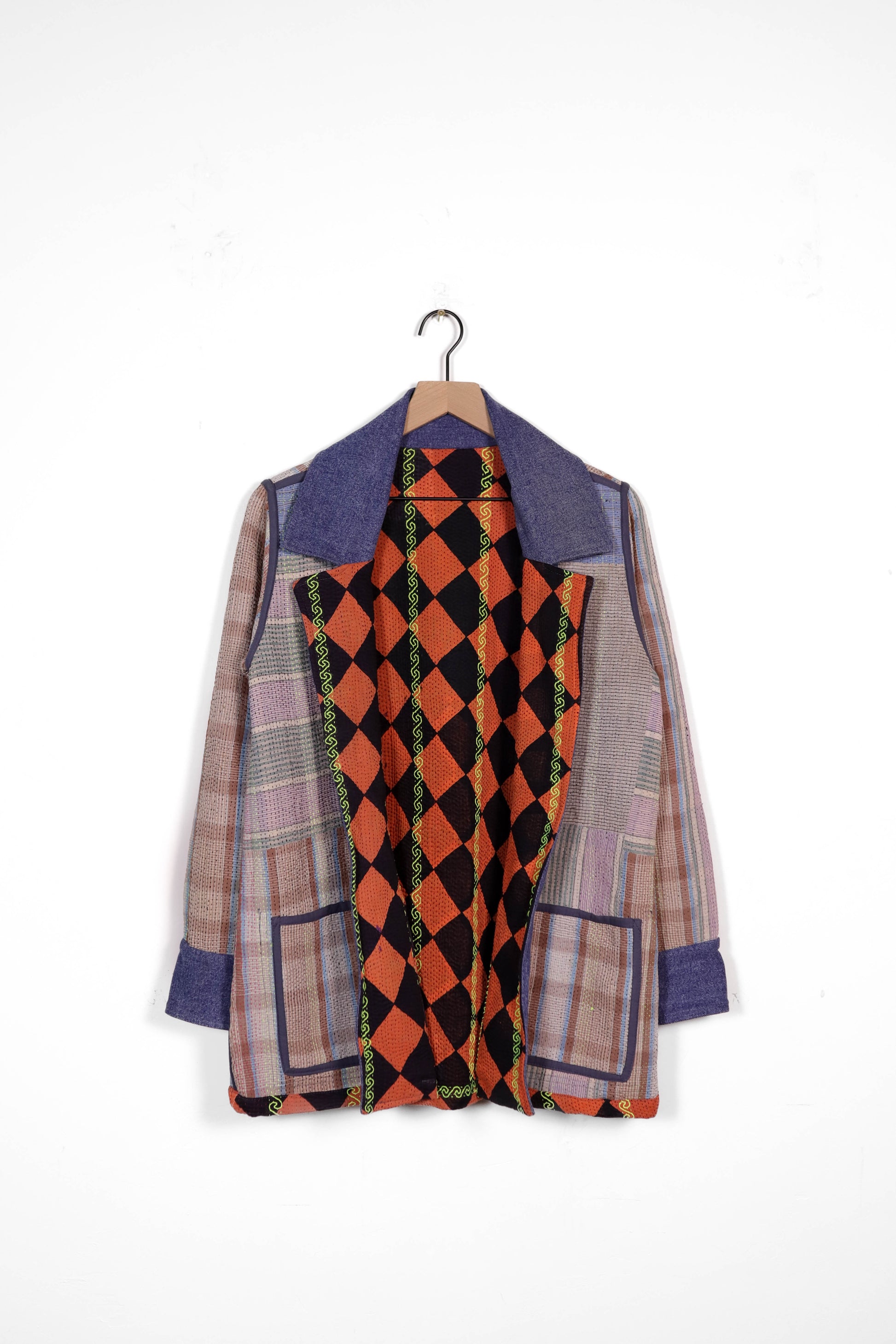 Every coat is one of a kind, made from a vintage kantha quilt. Layers of fabric bound by a hand sewn running stitch - your piece may have markings or worn areas that we find make our coats even more storied and unique.