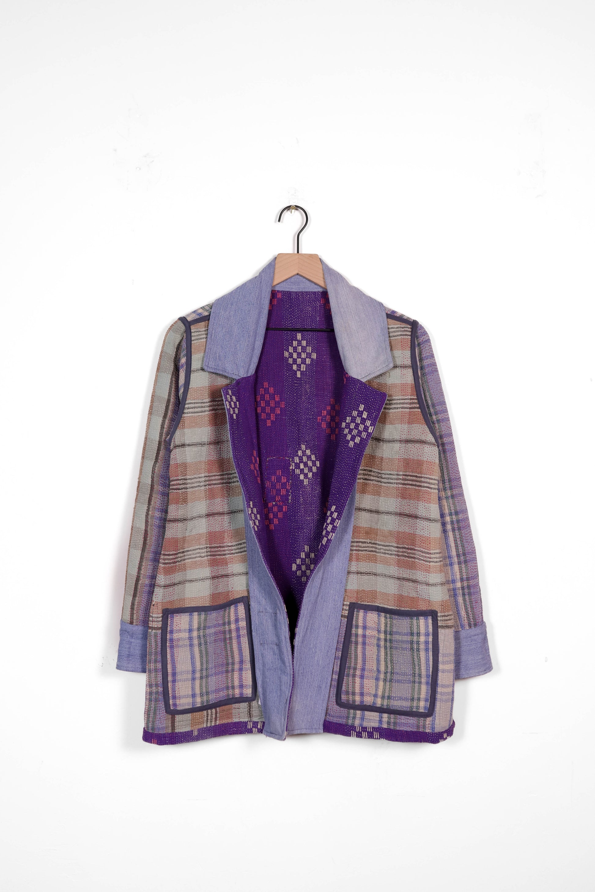 Every coat is one of a kind, made from a vintage kantha quilt. Layers of fabric bound by a hand sewn running stitch - your piece may have markings or worn areas that we find make our coats even more storied and unique.
